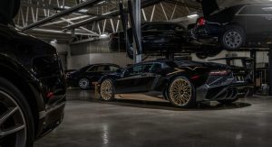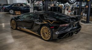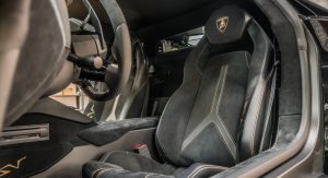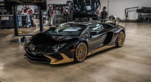 Evidently, the owner made full use of Lamborghini’s Ad Personam programme and had parts of the front bumper, side skirts, SV stickers and wheels painted gold. What’s more, the typical matte carbon fiber of a standard SV has been replaced by gloss carbon fiber on the rear diffuser, rear wing and air intakes.