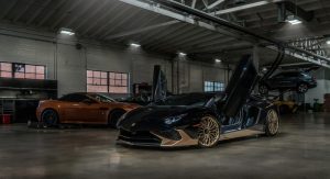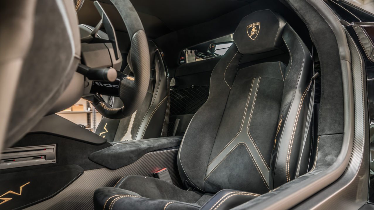 Inside, the supercar has been bathed in black alcantara and leather and features gold accents stitching and gold SV motifs.