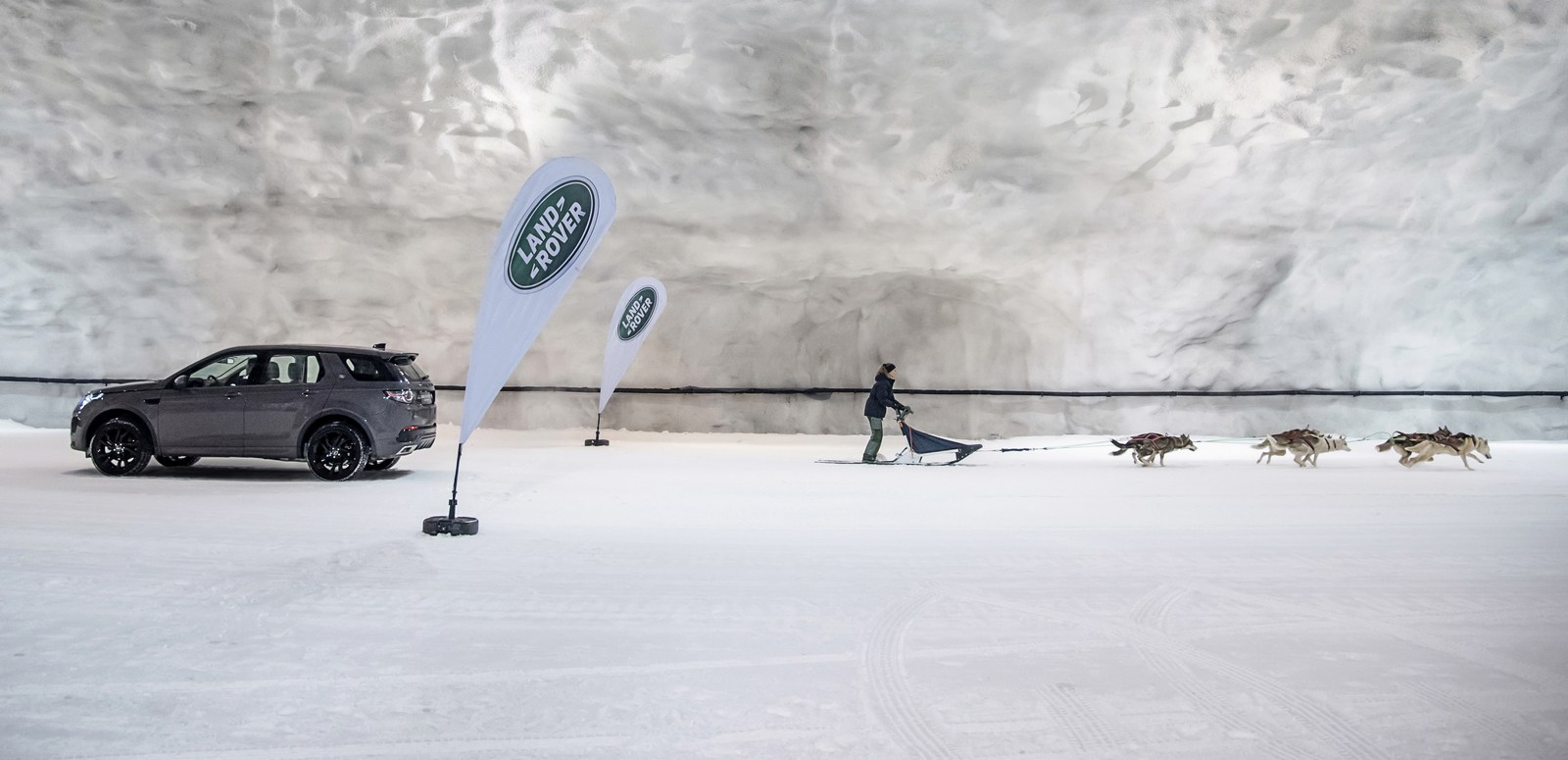 Since summer isn’t the best time for this kind of event, Land Rover traveled to the Vesileppis Ski Tunnel in Finland. The facility features an underground tunnel which is kept at a chilly 28.4°F (-2° C) and boasts nearly an inch of snow on the ground. This makes the one kilometer (0.62 mile) long course an ideal place for the Discovery Sport and the dog sled team to square off.