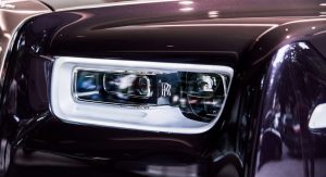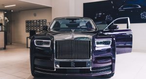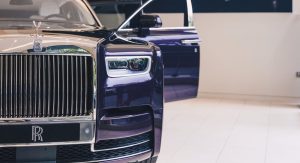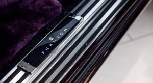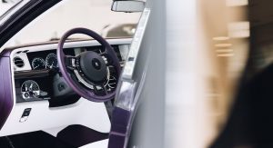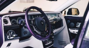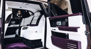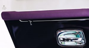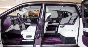 The ‘purple people eater’ theme continues in the cabin as this particular model has white leather upholstery with contrasting purple accents on the dashboard, steering wheel, and floor mats. Putting that aside, the latest pictures give us a better look at the Phantom’s luxurious interior which is decked out in piano wood trim and glistening chrome accents.