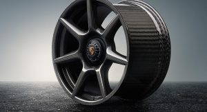 Each wheel is manufactured from a total of 18km (11miles) of carbon fiber, or 8 square meters (86 square feet) of carbon fiber fabric. The rim has two components: the center, made from carbon fabric, and the base, made from braided carbon fiber, by what Porsche claims to be “the world’s largest carbon fiber braiding machine, with a diameter of approximately nine meters (30ft)”.