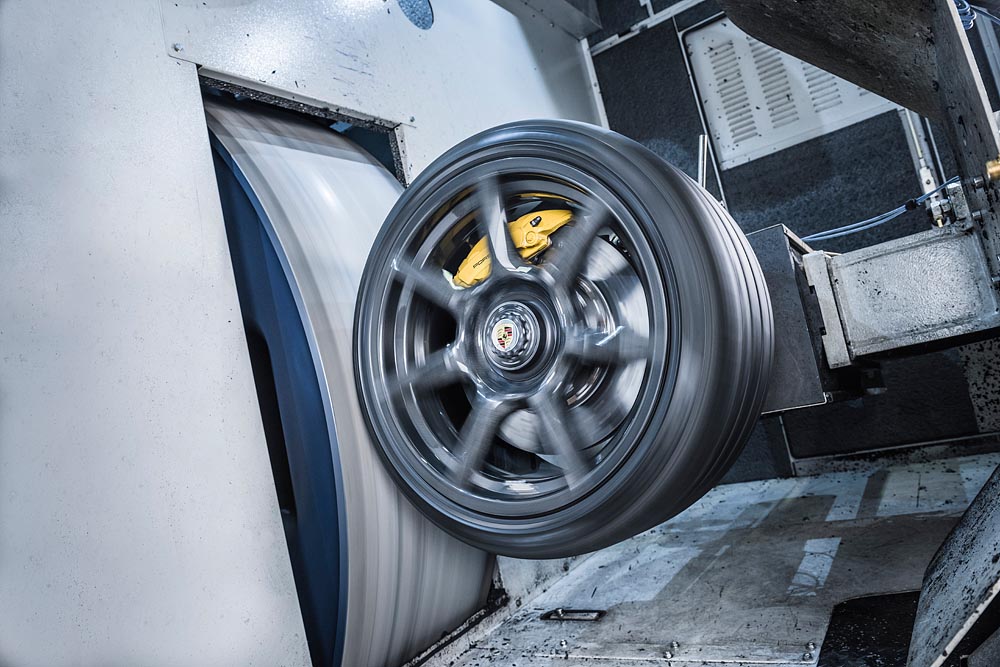 Each wheel is manufactured from a total of 18km (11miles) of carbon fiber, or 8 square meters (86 square feet) of carbon fiber fabric. The rim has two components: the center, made from carbon fabric, and the base, made from braided carbon fiber, by what Porsche claims to be “the world’s largest carbon fiber braiding machine, with a diameter of approximately nine meters (30ft)”.