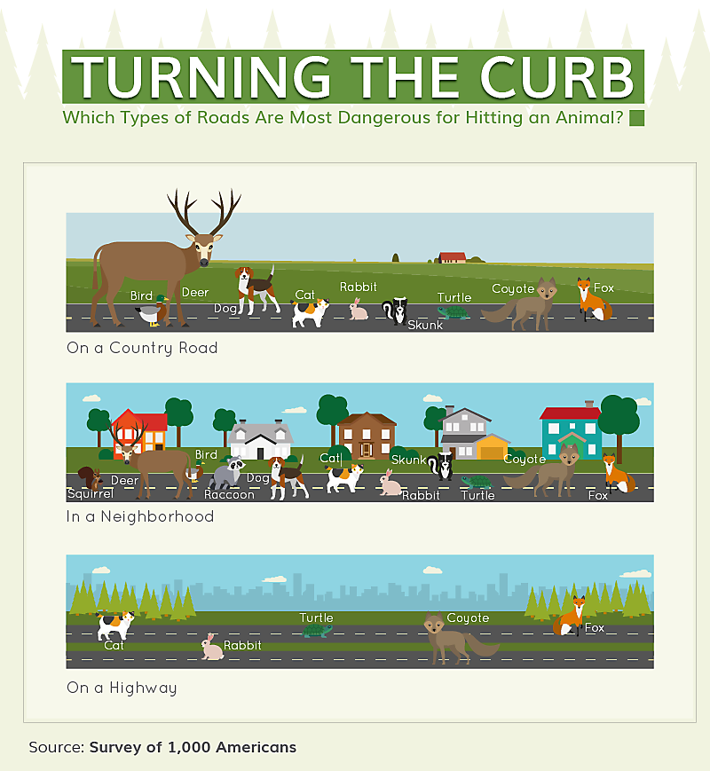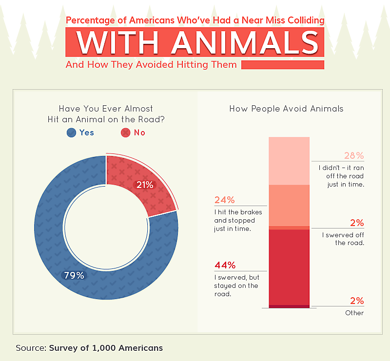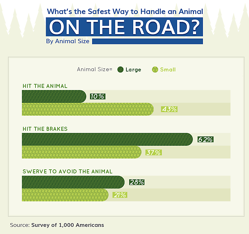 Of those surveyed, 79 per cent said they had or almost had hit an animal while driving and that most think it is better to actually hit a small animal than try to swerve around it or brake before making contact. When it comes to larger animals however, including deer, over 60 per cent of respondents said the best thing to do is brake to avoid an impact.