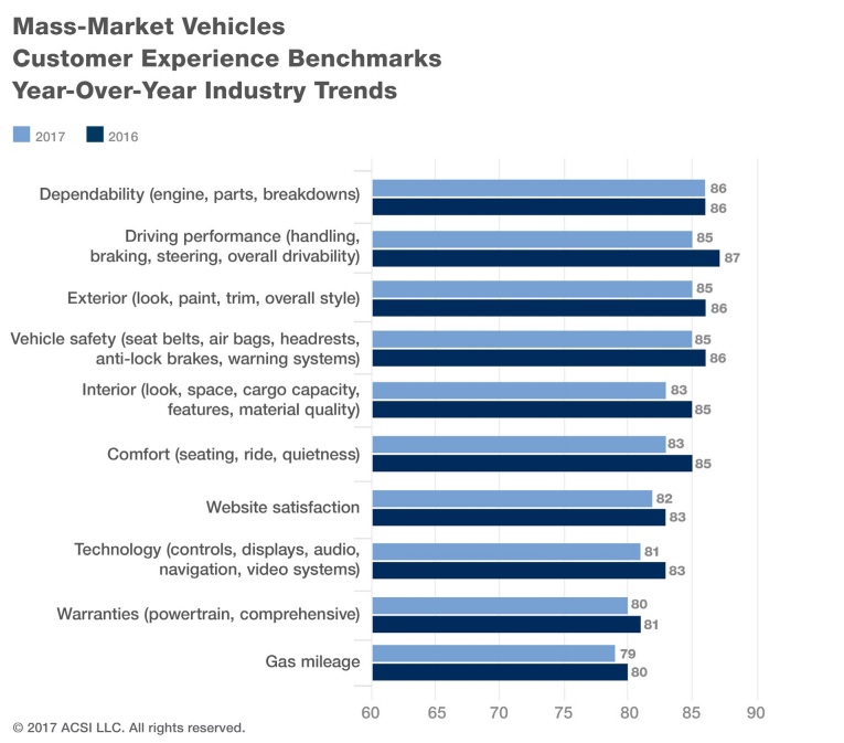 On the luxury side, the top three brands were Lexus (86), Mercedes (84), and Cadillac (83). Acura finished last with a score of 80 but that’s a significant improvement from 2016 when the company only received a score of 76.