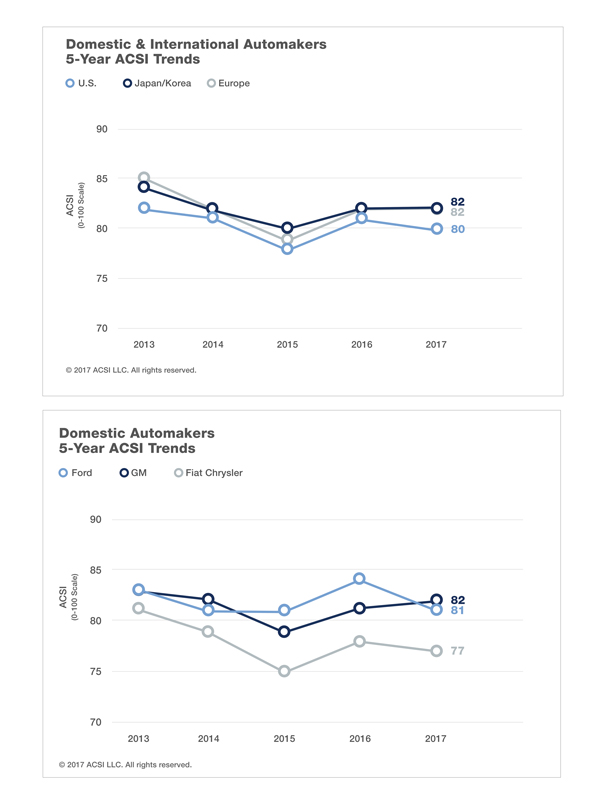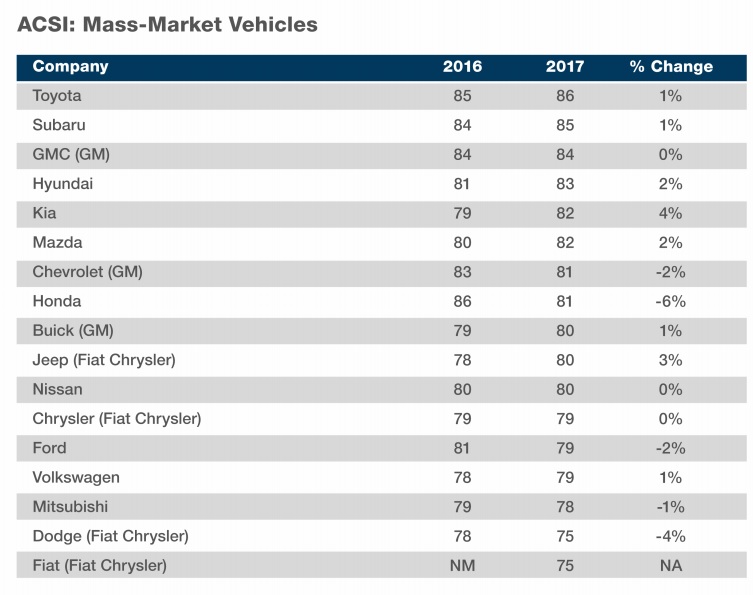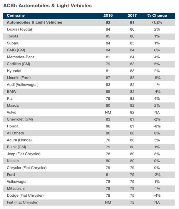 American automakers, in particular, took a hit as General Motors was the only company to see it satisfaction score climb this year. The company received a score of 82 which put it ahead of rivals such as Ford (81) and Fiat Chrysler Automobiles (77).