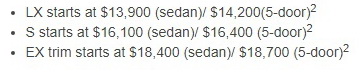Pricing starts at $13,900 for the LX Sedan model, with the hatchback costing from $14,200. Top EX models start from $18,400 (sedan) and $18,700 (hatchback).