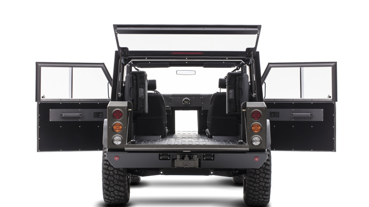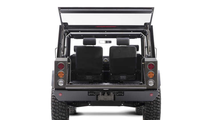 The longer version of the “world’s first all-electric sport utility truck” brings the overall length of the vehicle to 159 inches (4 meters), with the wheelbase measuring 114 inches (2.9 meters). Ground clearance remains the same with the three-door version at 15.5 in (400mm), as well as the approach and departures angles (56 degrees and 53 degrees respectively). The new breakover angle is 31 degrees.