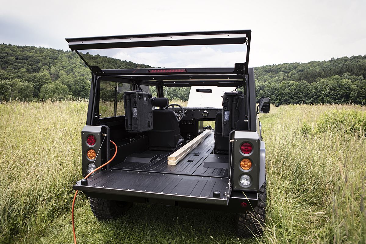 The boxy shape reminds us of the classic Land Rover Defender, portraying a tough off-road character but with the added merits of an all-electric powertrain.