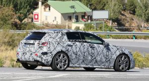 Unlike previous testers, this one is also wearing AMG wheels, while giving us a small taste of what that aggressive front bumper will look like once the camouflage comes off.