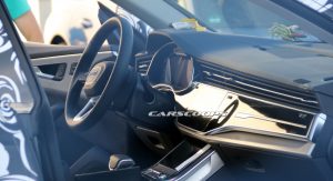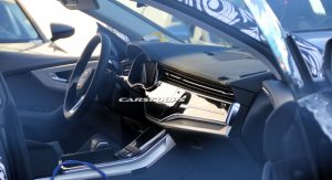 As we can see, the dashboard features an almost full-length air-vent setup, just like in the Q7, but then it goes on with a pair of digital touchscreen displays as seen in the Audi A8.