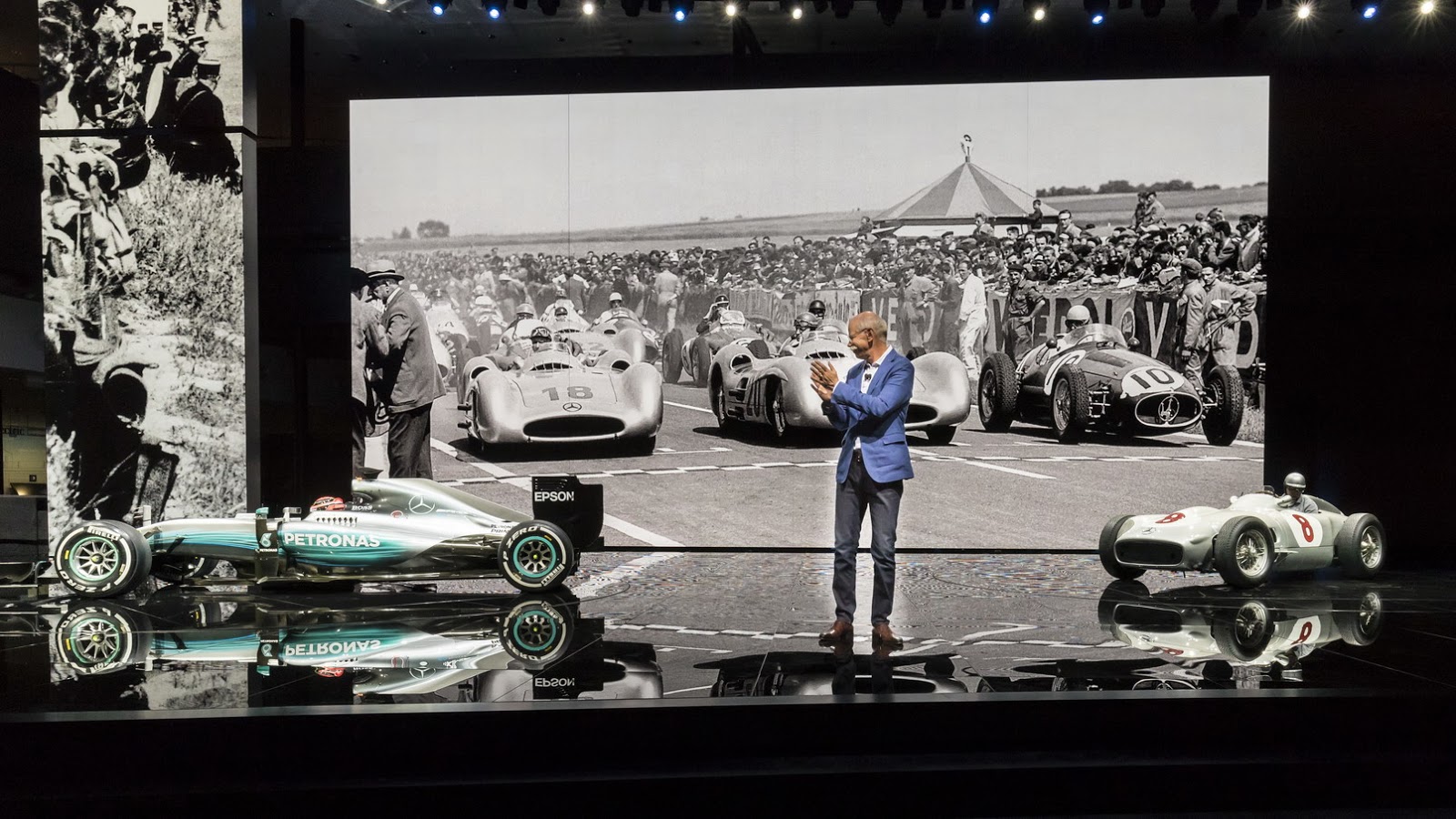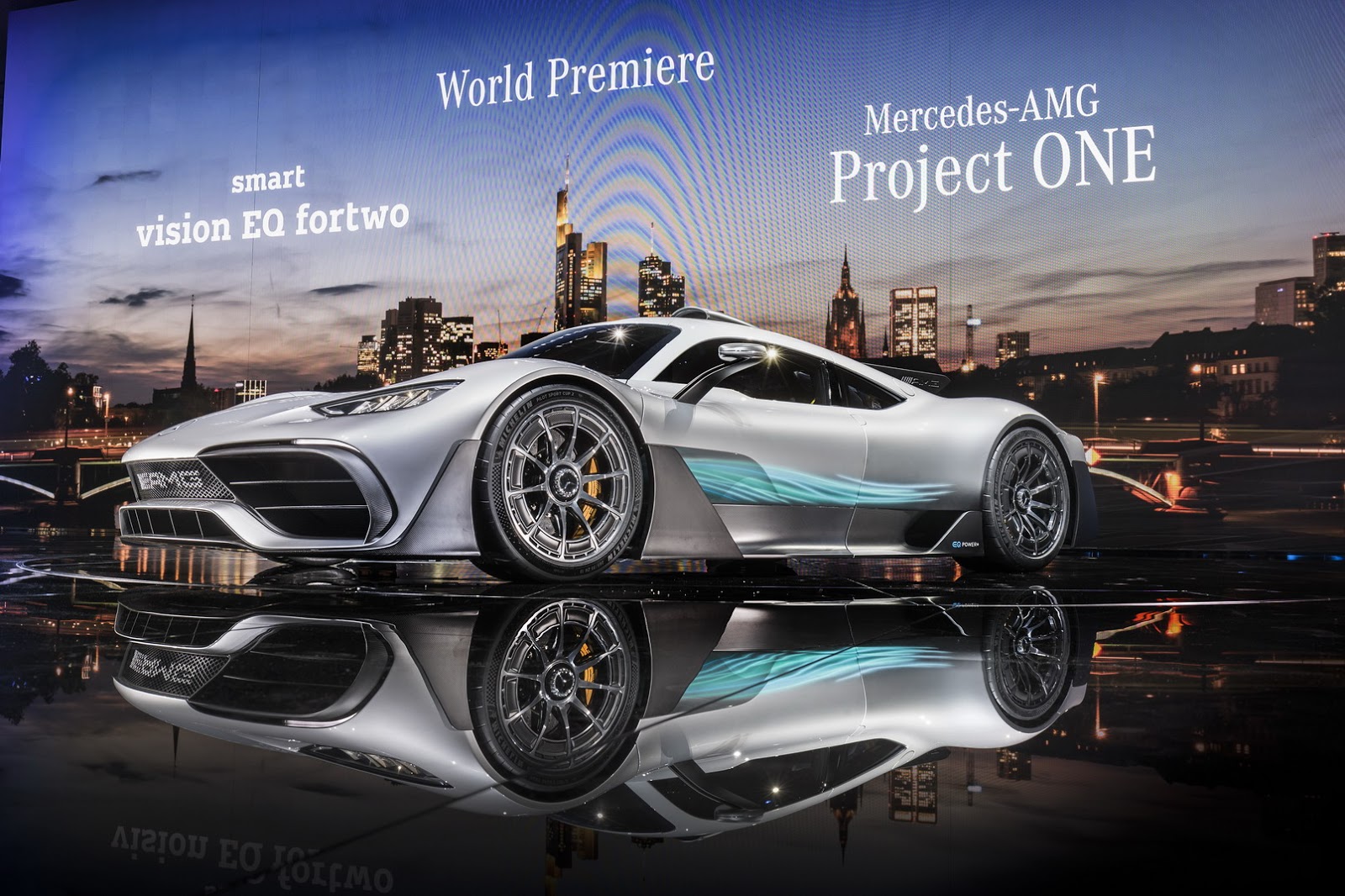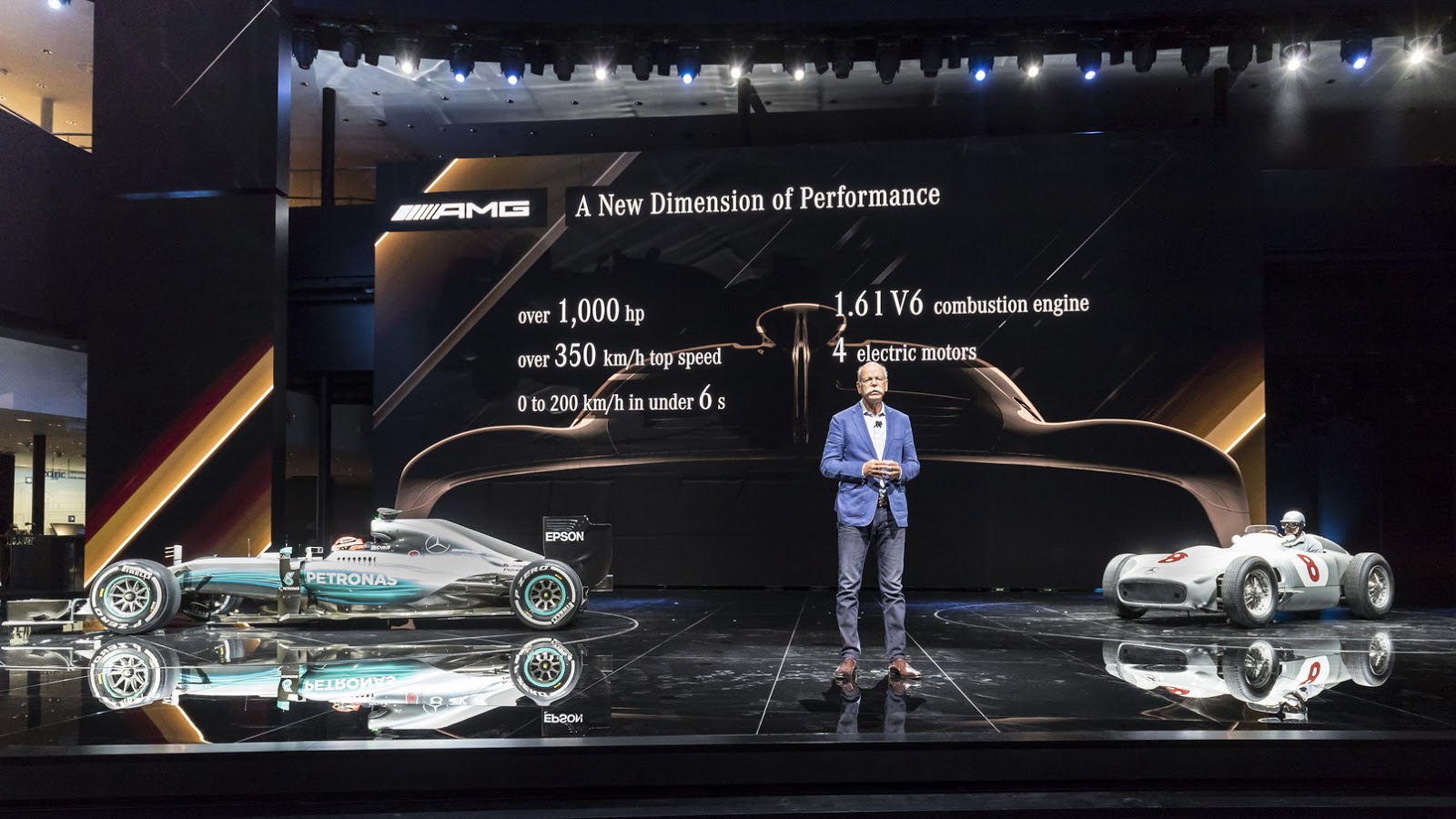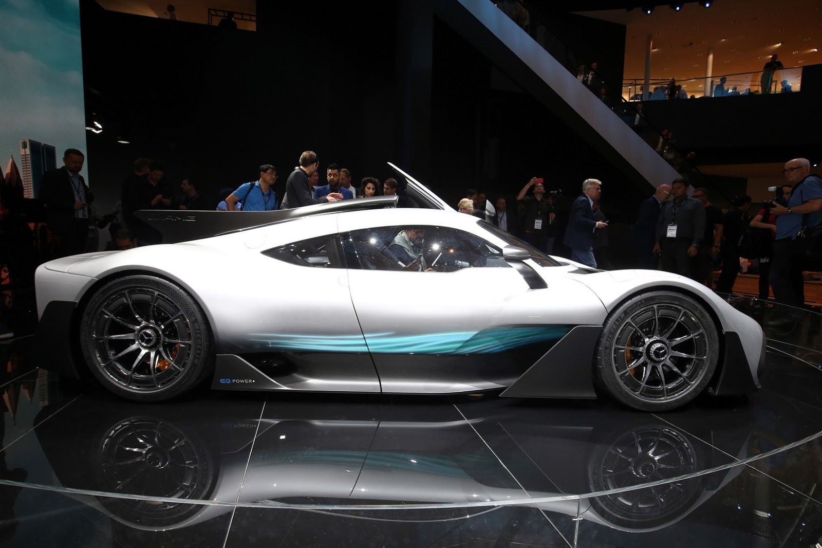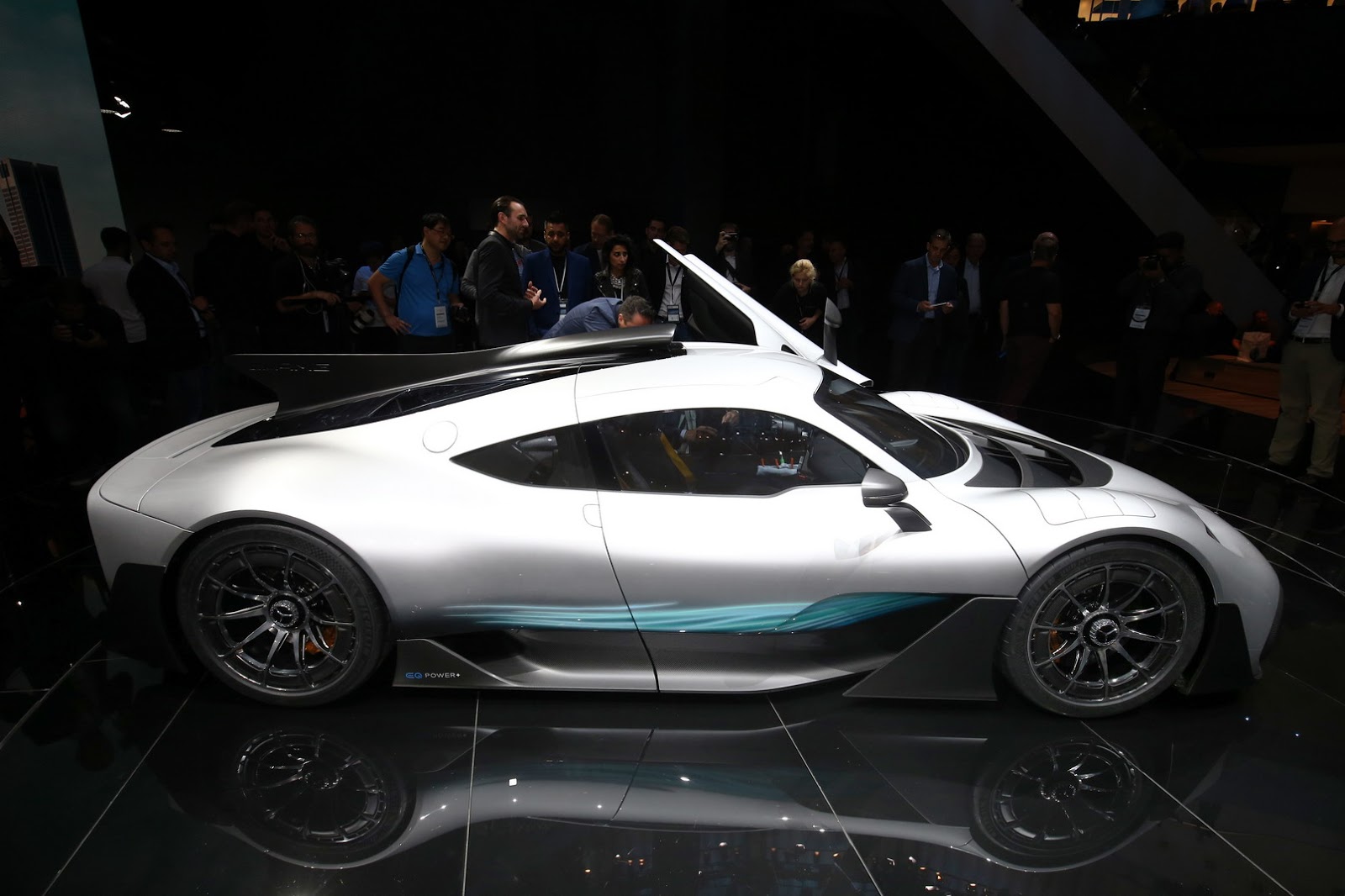 Power comes from a reworked version of the hybrid system found in the W08 F1 car, including the turbocharged 1.6-liter V6 engine and no less than four electric motors.