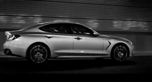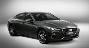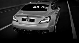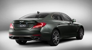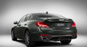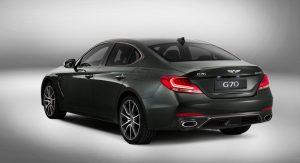 The rear looks pretty appealing too as the G70 has an integrated trunk spoiler and a sporty dual exhaust system. We can also see stylish taillights and a dark lower rear fascia.