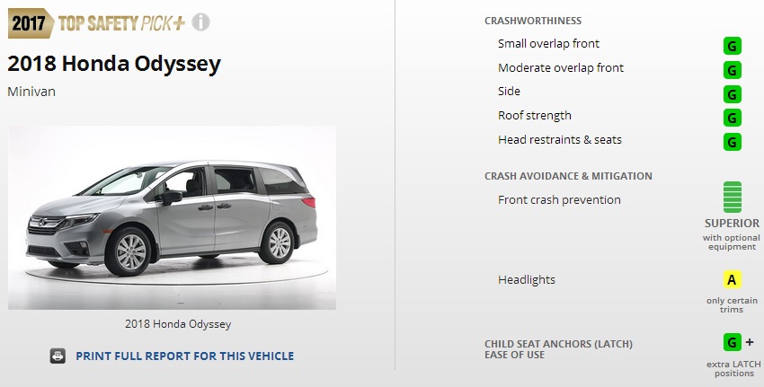 Honda seems to have done a good job in designing and engineering the 2018 Odyssey, as the latest generation of the minivan has earned a Top Safety Pick + rating from the Insurance Institute for Highway Safety (IIHS).