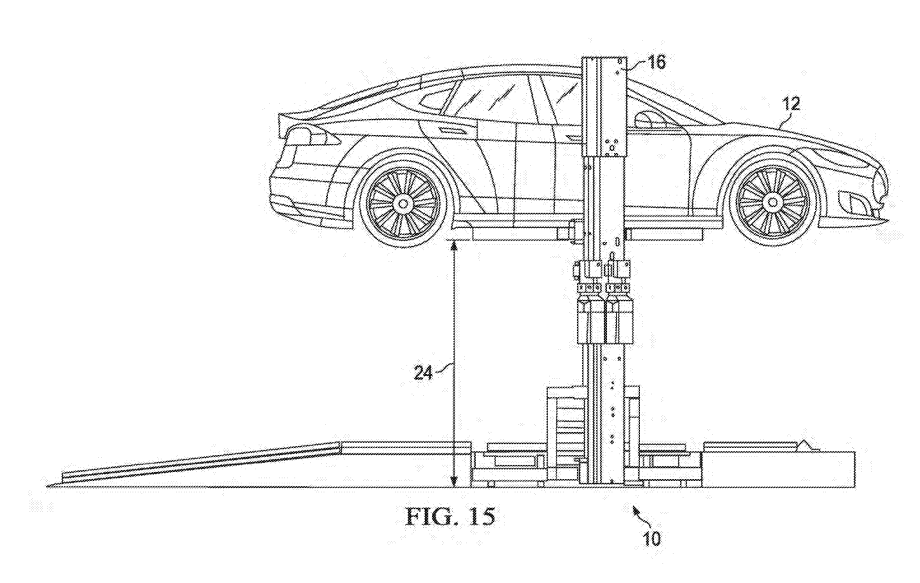The patent includes 52 pages of drawings that depicts a battery swap system which involves a vehicle lift like most mechanics use and a smaller lift which is able to lower the vehicle’s battery pack and replace it with a different one. It is also revealed in the patent that the system could be installed in a service station or form part of a mobile rig.
