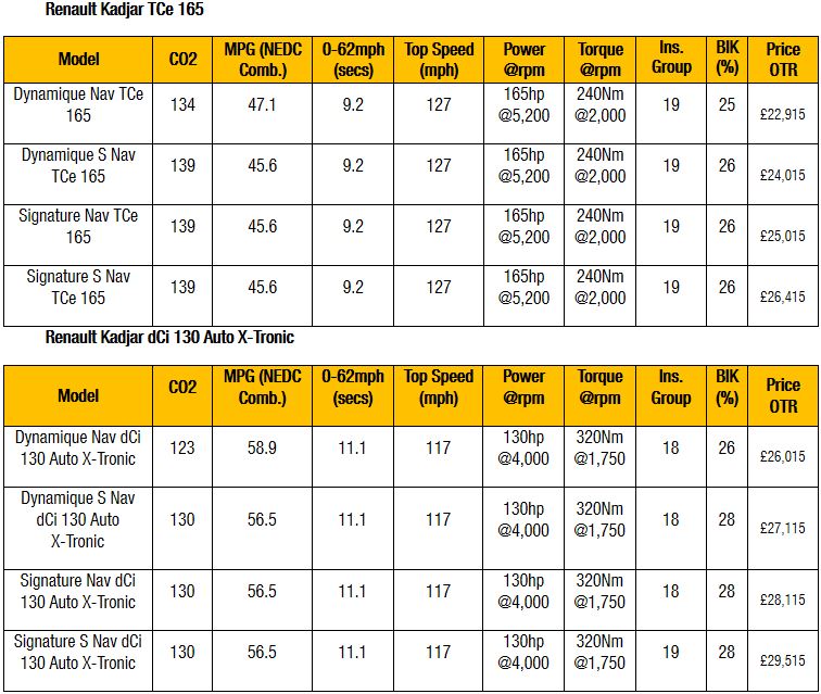 The new engine is a TCe 165 petrol unit, where 165 is the amount of horsepower produced. Using this engine, the Kadjar TCe 165 can hit 60 mph (96 km/h) in 9.2 seconds, and max out at 127 mph (204 km/h). The price for a TCe 165 in entry-level Dynamique Nav trim is £22,915.