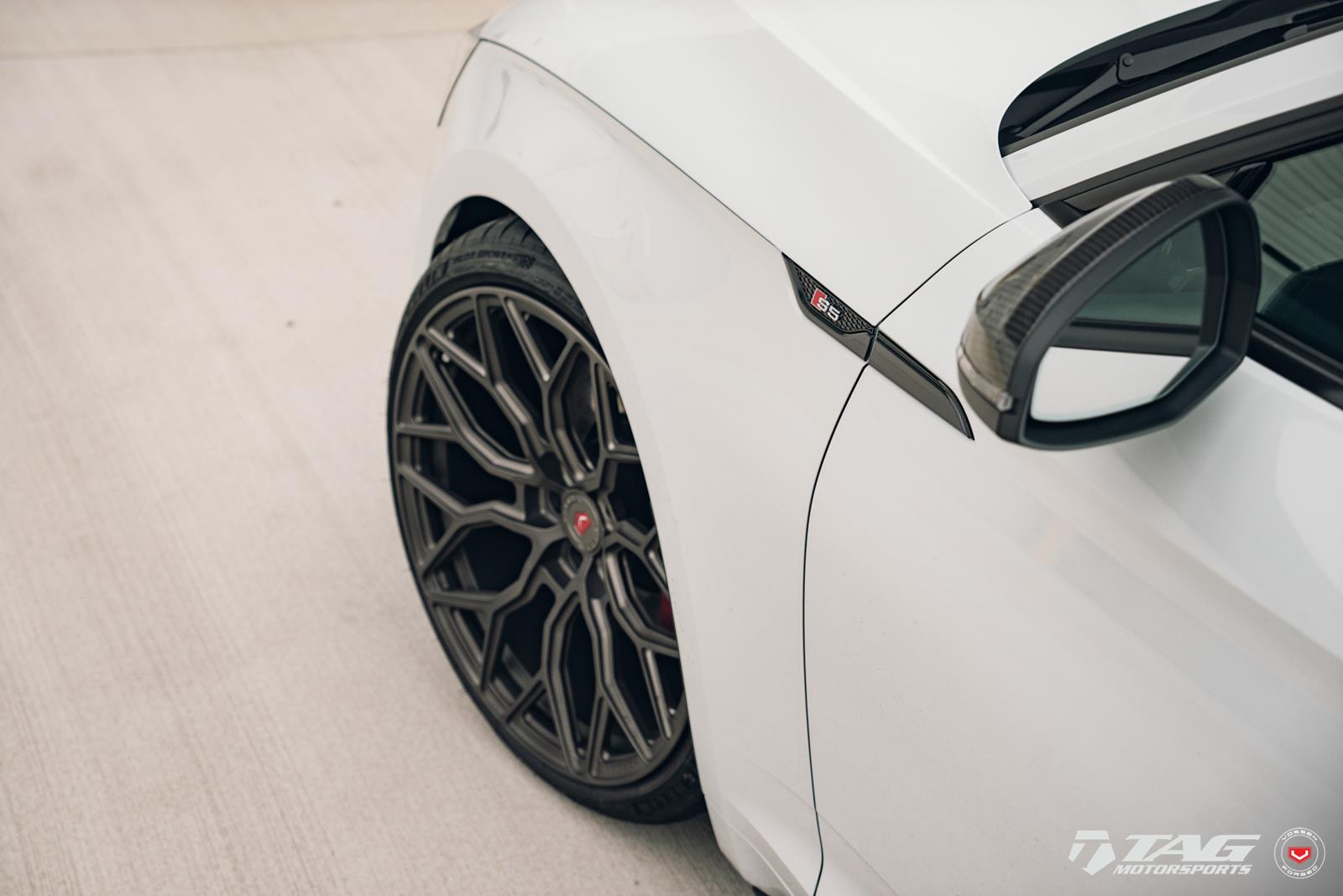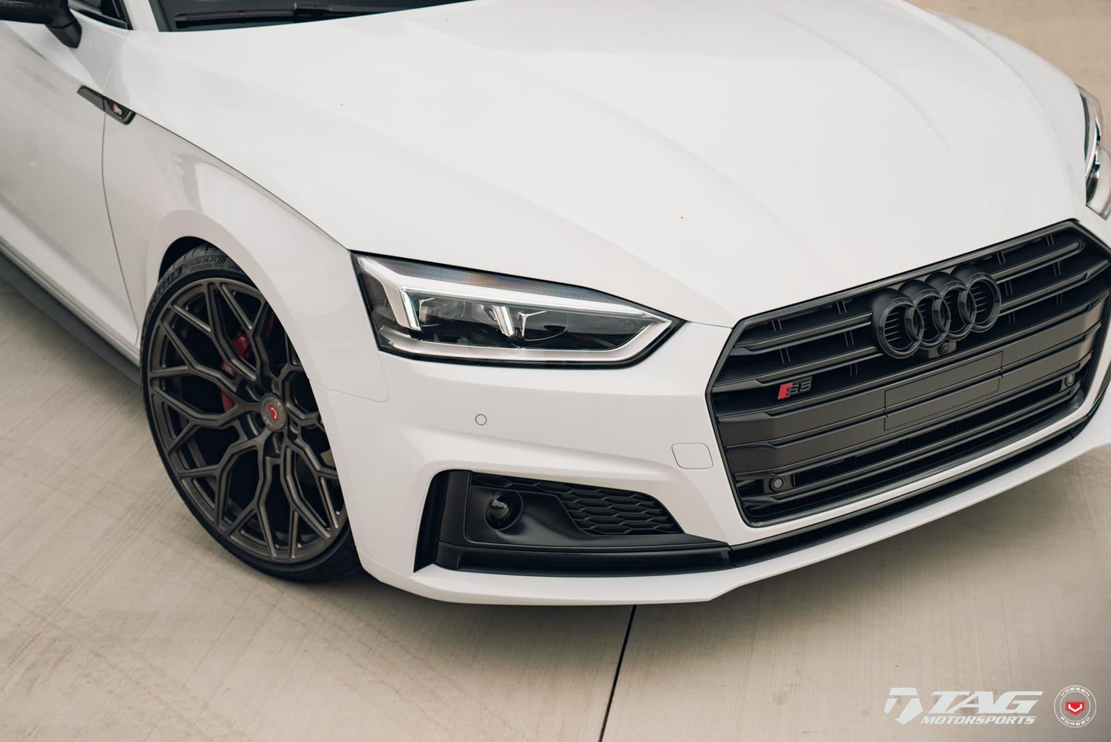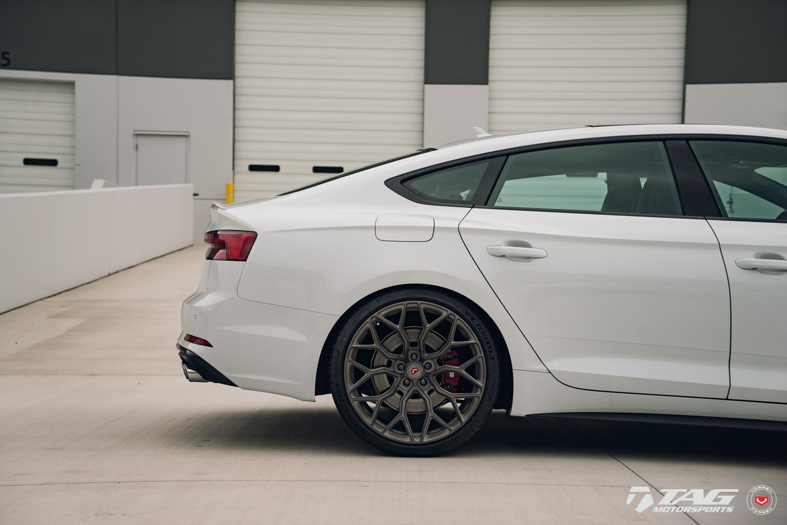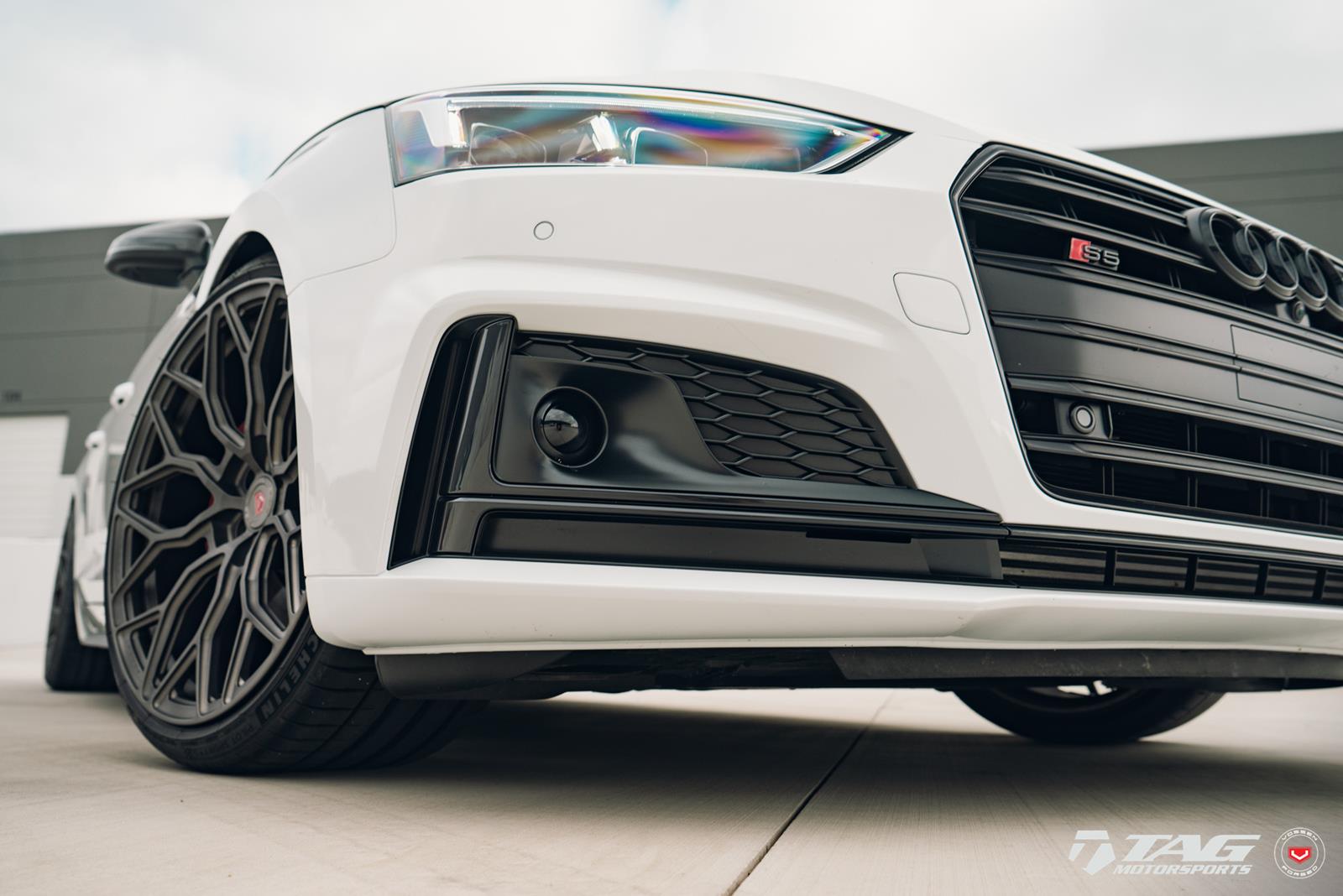This white S5 Sportback is riding on a set of stealth gray 20″ Vossen Forged Series 17 wheels (S17-01), featuring an intricate multi spoke design that branches out before making contact with the lip.