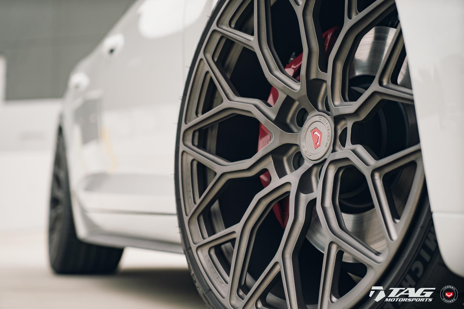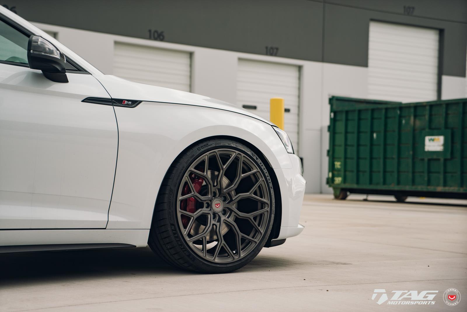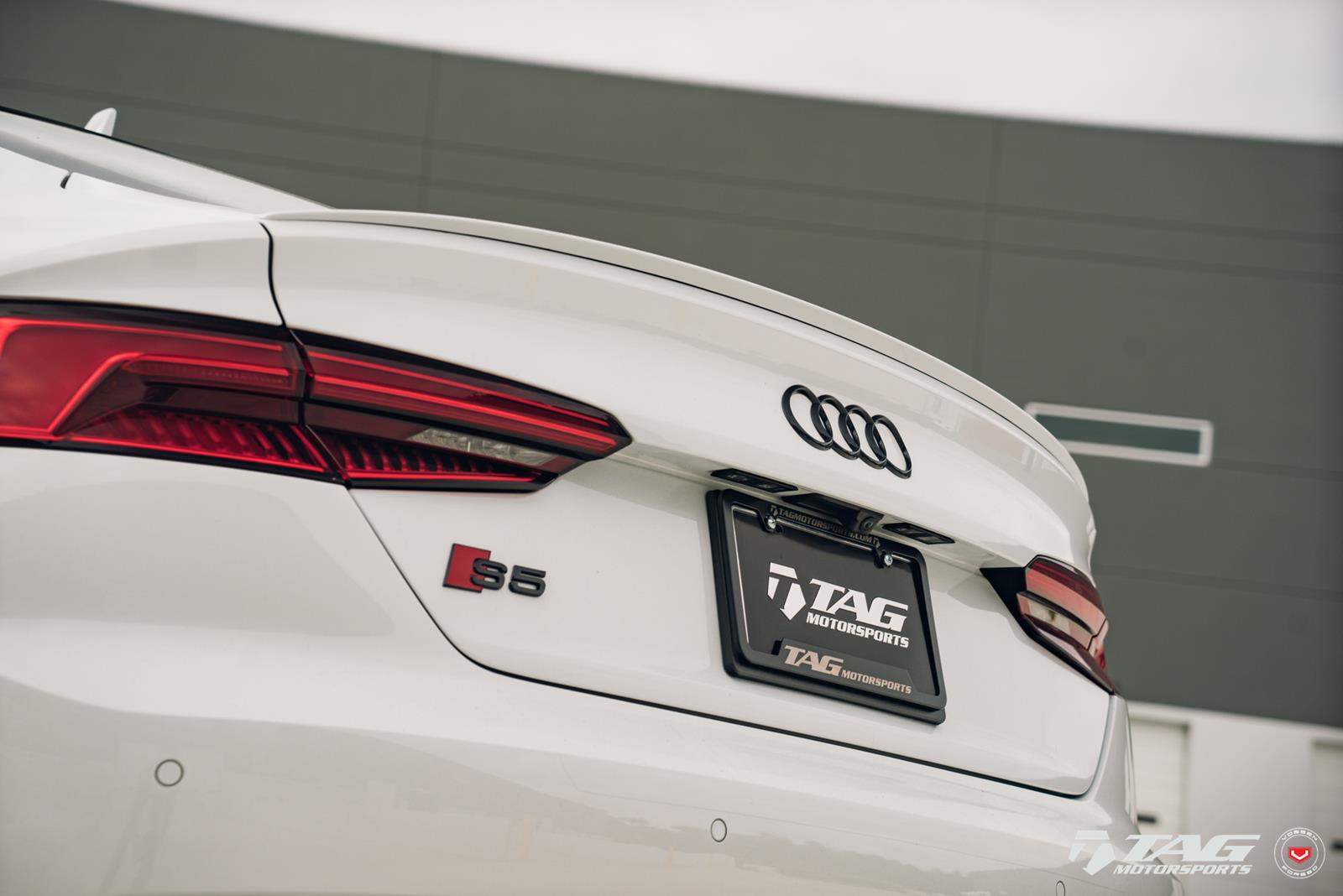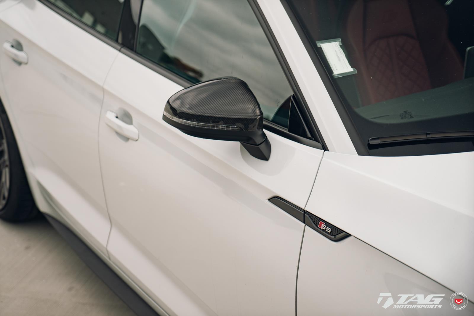 This white S5 Sportback is riding on a set of stealth gray 20″ Vossen Forged Series 17 wheels (S17-01), featuring an intricate multi spoke design that branches out before making contact with the lip.