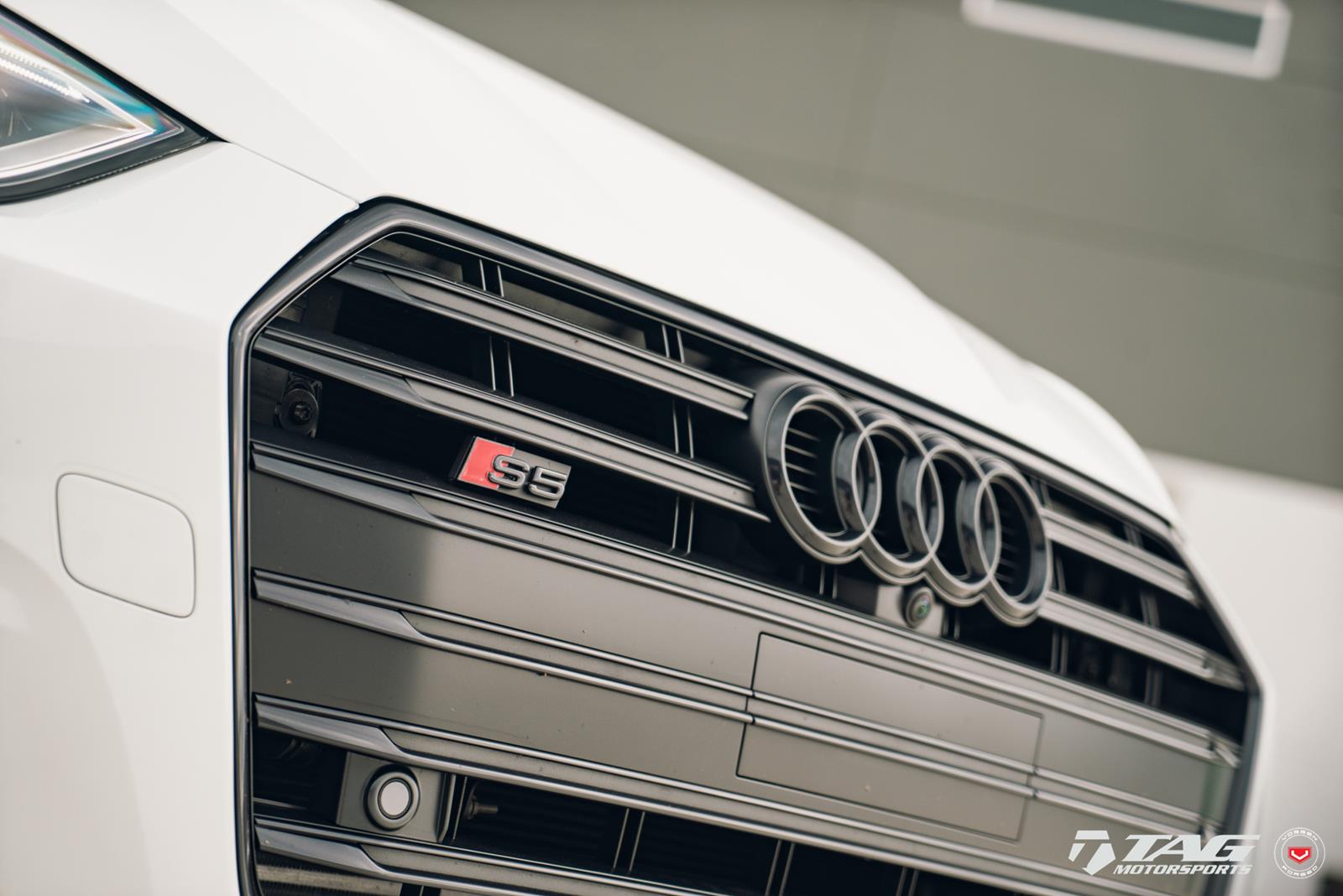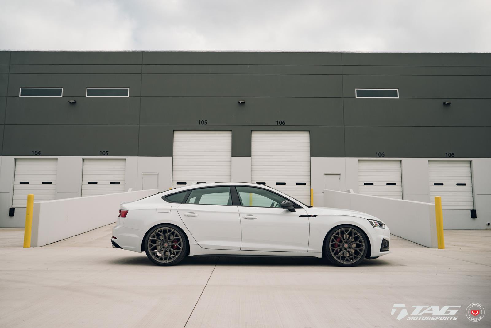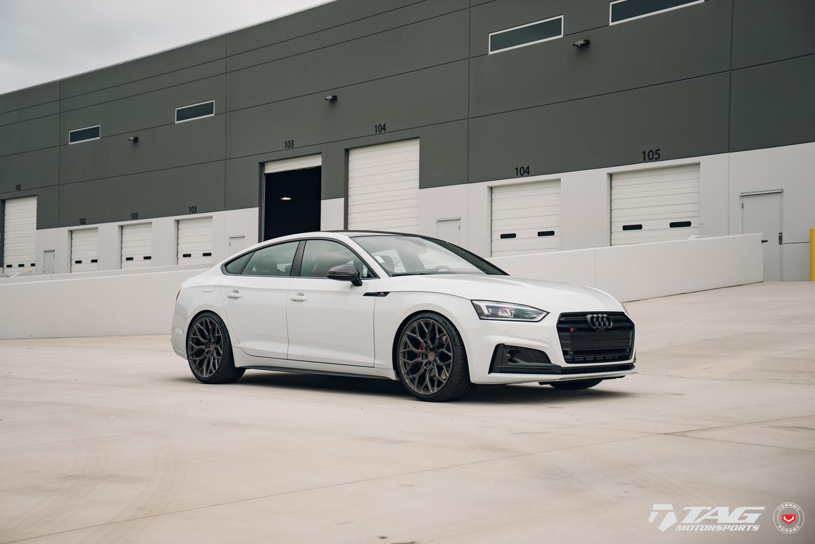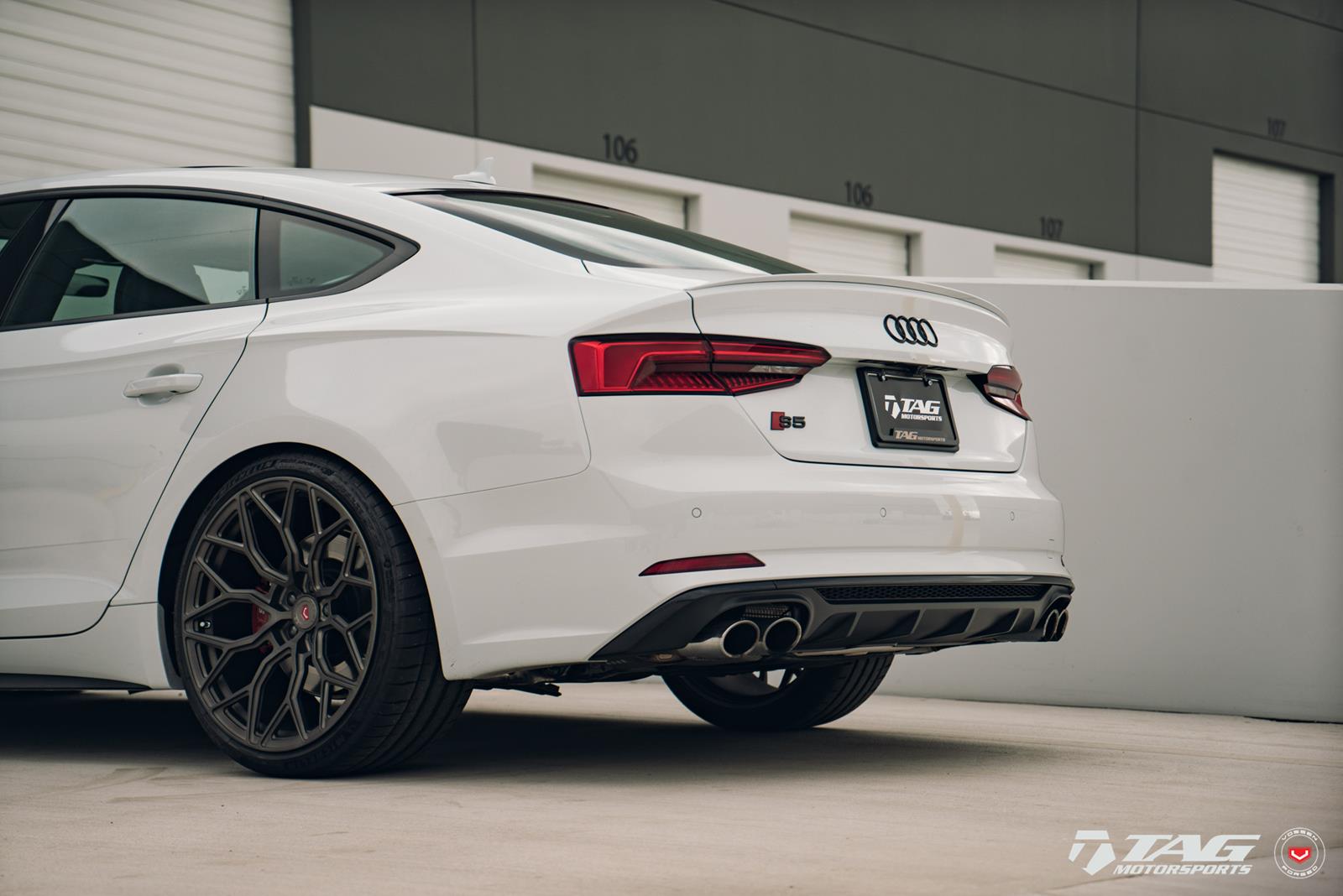 This white S5 Sportback is riding on a set of stealth gray 20″ Vossen Forged Series 17 wheels (S17-01), featuring an intricate multi spoke design that branches out before making contact with the lip.