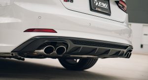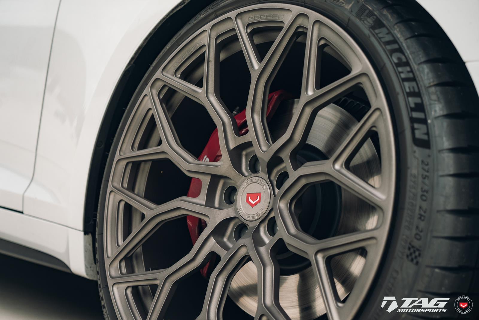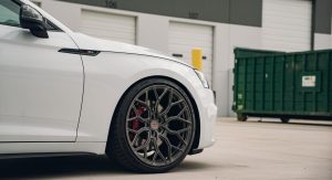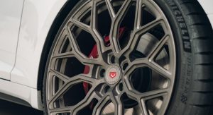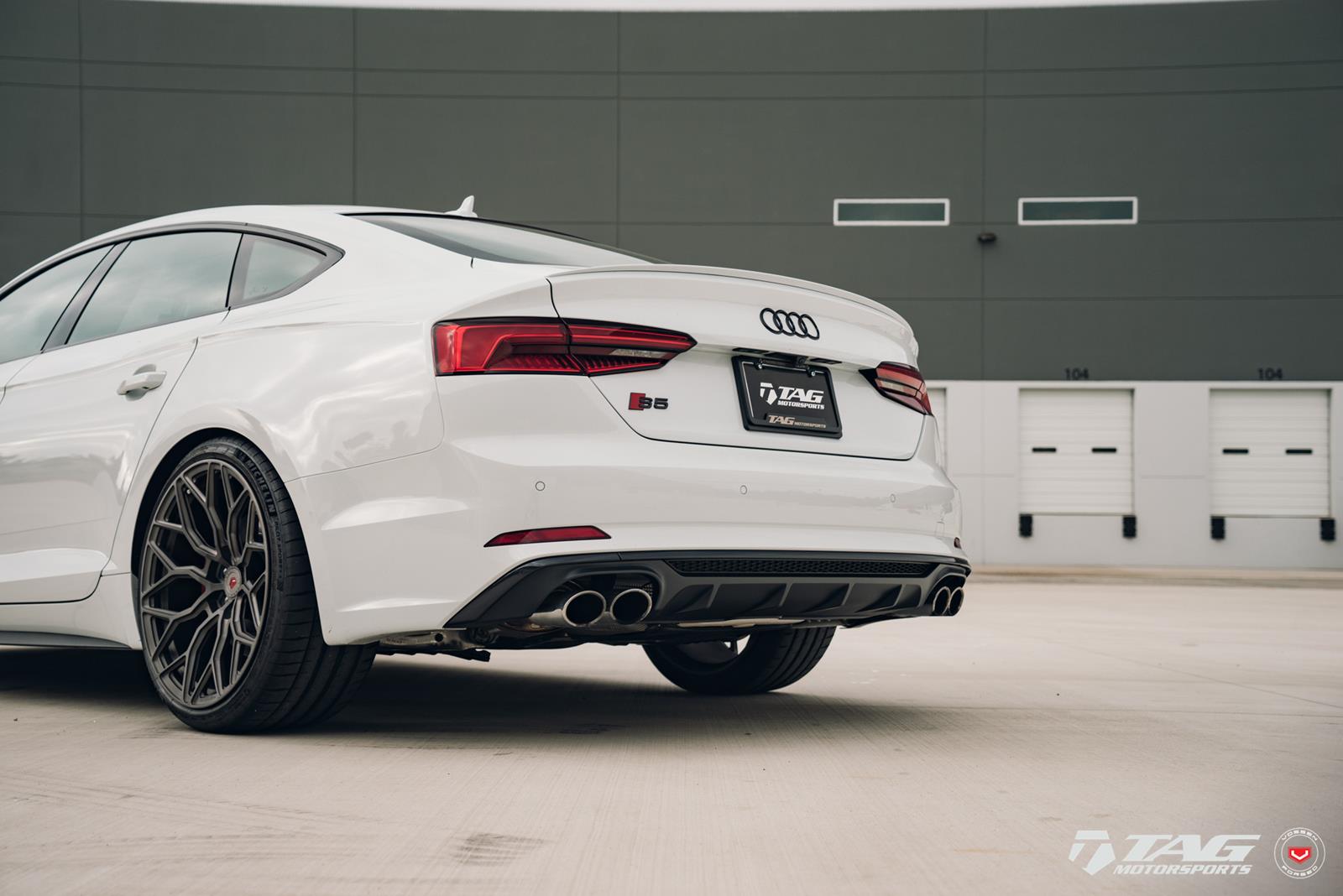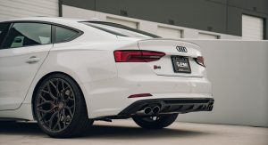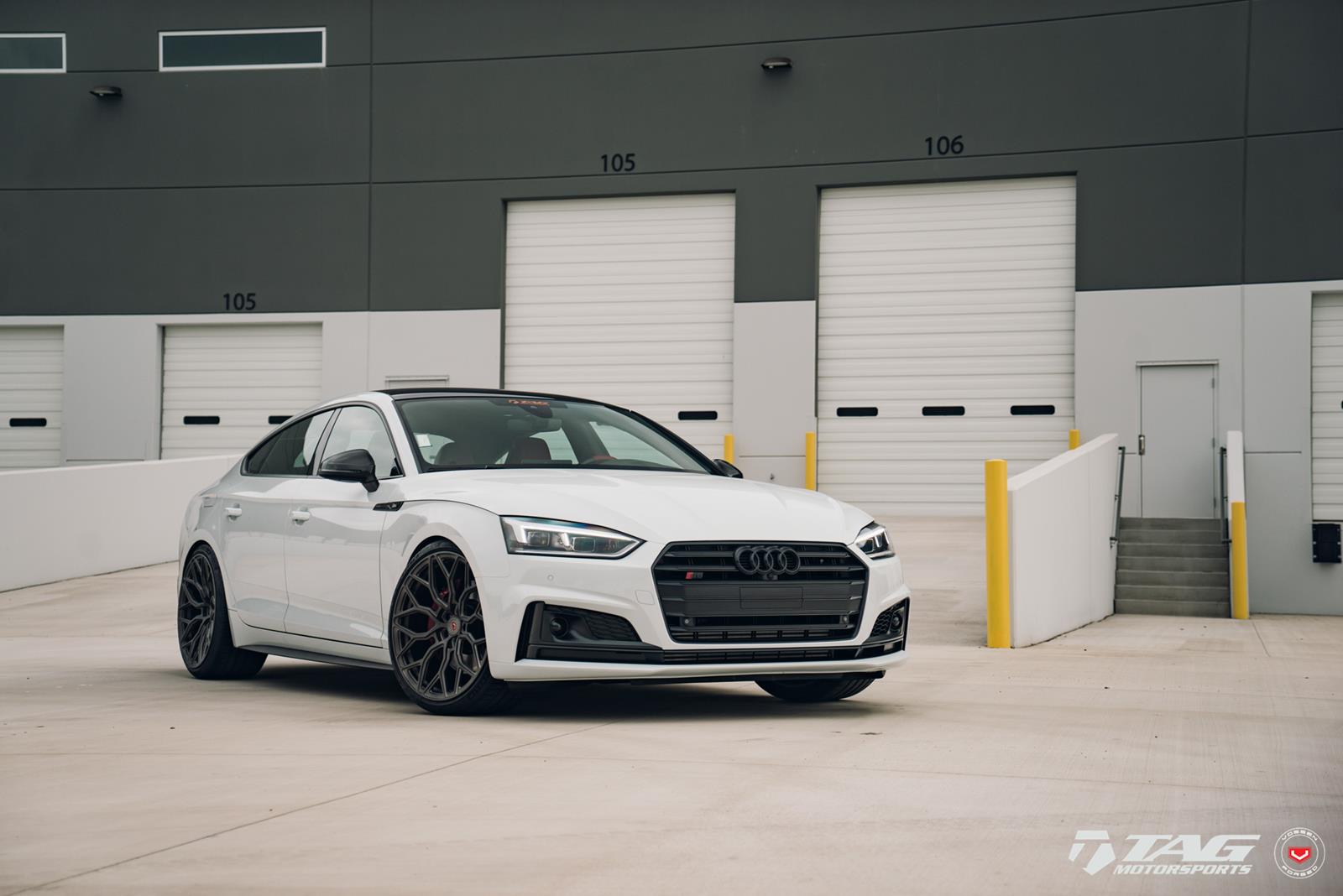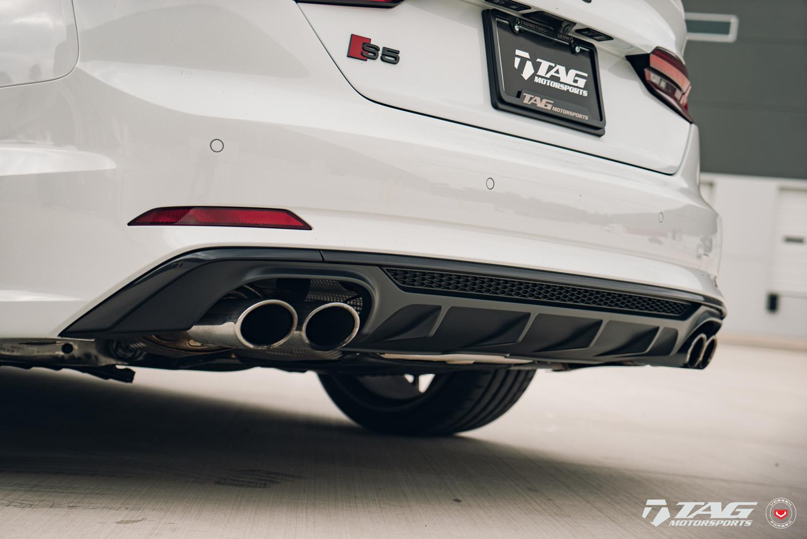 This white S5 Sportback is riding on a set of stealth gray 20″ Vossen Forged Series 17 wheels (S17-01), featuring an intricate multi spoke design that branches out before making contact with the lip.