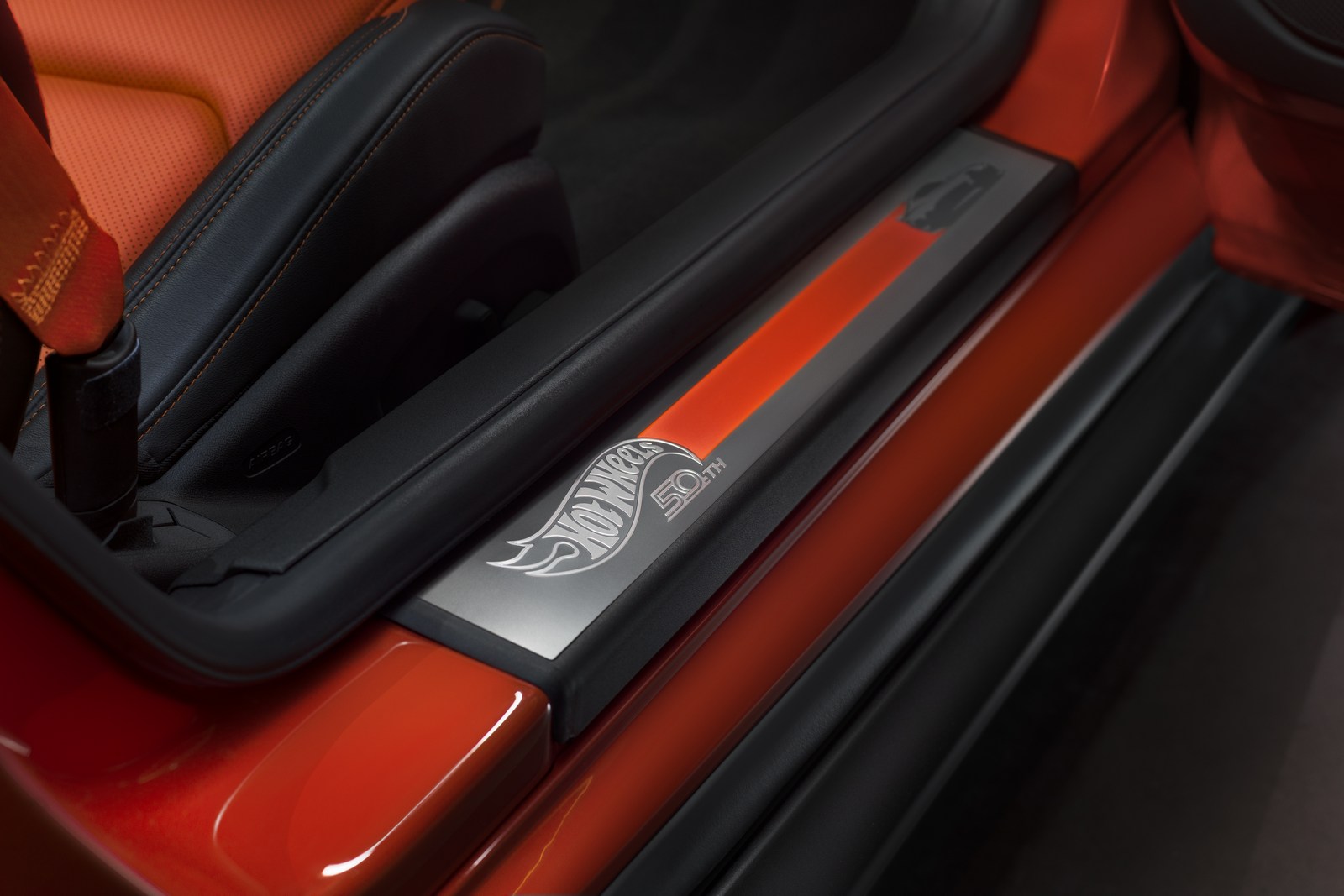 The styling changes continue in the cabin as designers installed black leather seats with orange inserts and orange contrast stitching. Drivers will also find embossed headrests, orange kneepads, and orange seat belts. Other highlights include illuminated doorsill plates, special floor mats, and a 50th Anniversary Hot Wheels badge on the steering wheel.