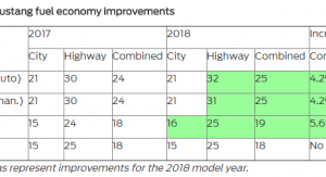 Thanks to the aerodynamic styling tweaks, the 2018 Mustang EcoBoost has an EPA-estimated fuel economy rating of 21 mpg city / 31 mpg highway / 25 mpg combined with the manual transmission and 21 mpg city / 32 mpg highway / 25 mpg combined with the automatic. The numbers for the Mustang GT largely carryover but the automatic version is slightly more efficient as it gets an additional 1 mpg for its city and combined rating.