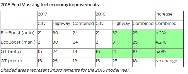 Thanks to the aerodynamic styling tweaks, the 2018 Mustang EcoBoost has an EPA-estimated fuel economy rating of 21 mpg city / 31 mpg highway / 25 mpg combined with the manual transmission and 21 mpg city / 32 mpg highway / 25 mpg combined with the automatic. The numbers for the Mustang GT largely carryover but the automatic version is slightly more efficient as it gets an additional 1 mpg for its city and combined rating.
