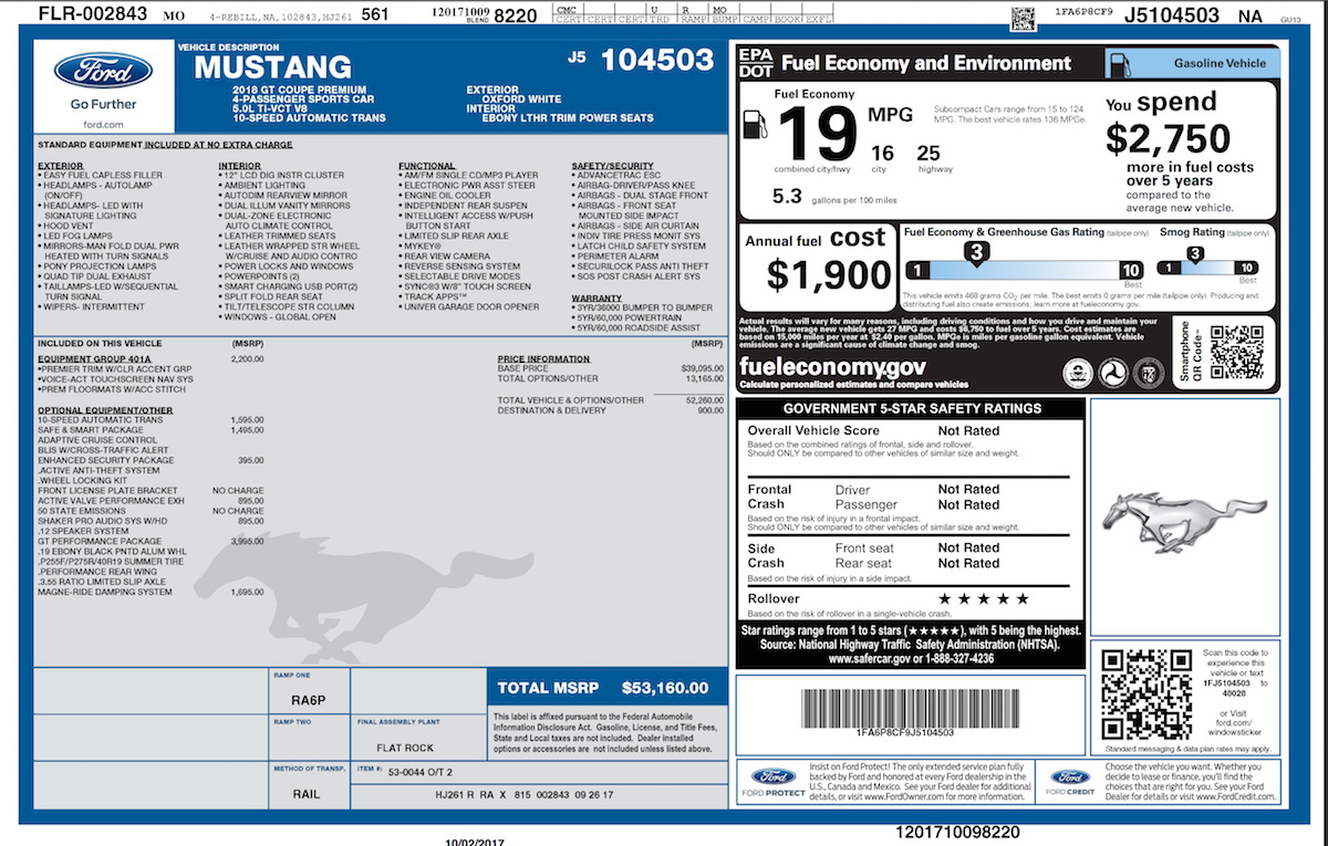 Thanks to a Mustang6G member, we can now see the official window sticker for the 2018 Mustang GT with the 10-speed automatic transmission, showing the vehicle’s 1 mpg bump in city and combined environments.