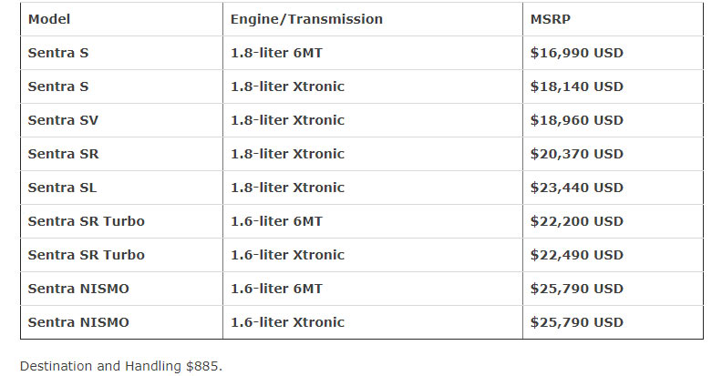Nissan has revealed that the 2018 Sentra will be priced from $16,990 in the U.S. and top out at $25,790, excluding destination fees, for the range-topping model.