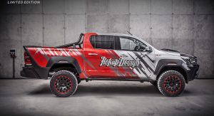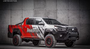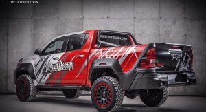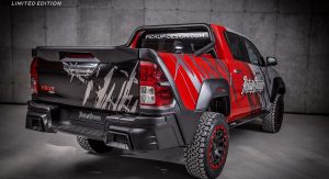 Speaking of the Hilux’s exterior, it has become barely recognizable. The modifications begin with an all-new front fascia with a custom grille and air intakes, LED light bar, new fog lights and an extremely aggressive bumper that you’d only expect to see from TRD.