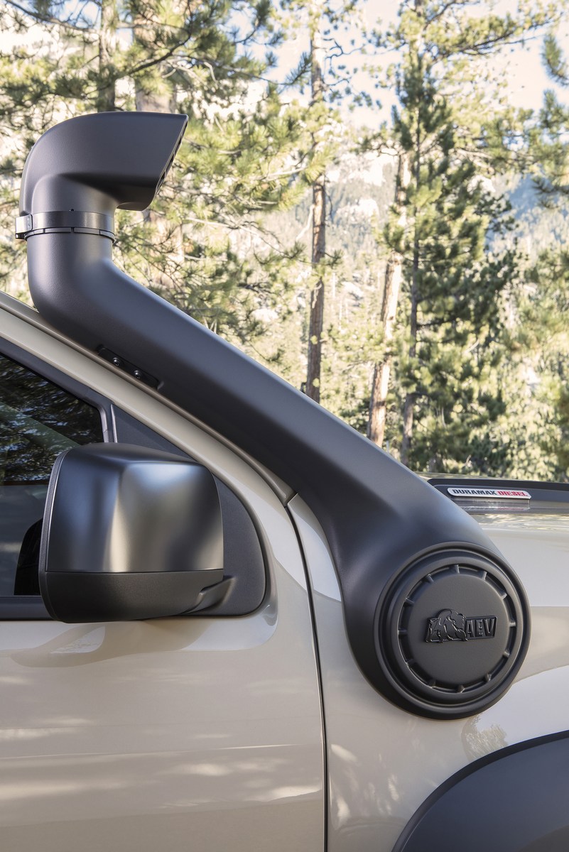 Created in collaboration with American Expedition Vehicles, the concept has been equipped with new bumpers, underbody skid plates, and extended fender flares. The truck also boasts an expedition bed rack, a snorkel, and beadlock wheels that are wrapped in 35-inch BF Goodrich KM2 Mud-Terrain tires.