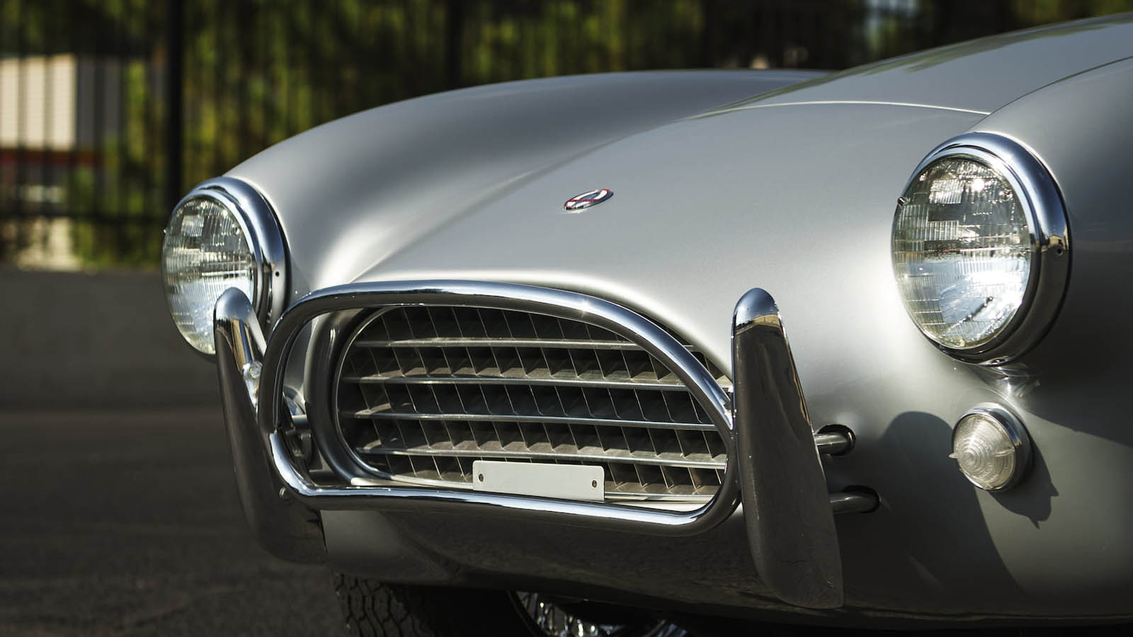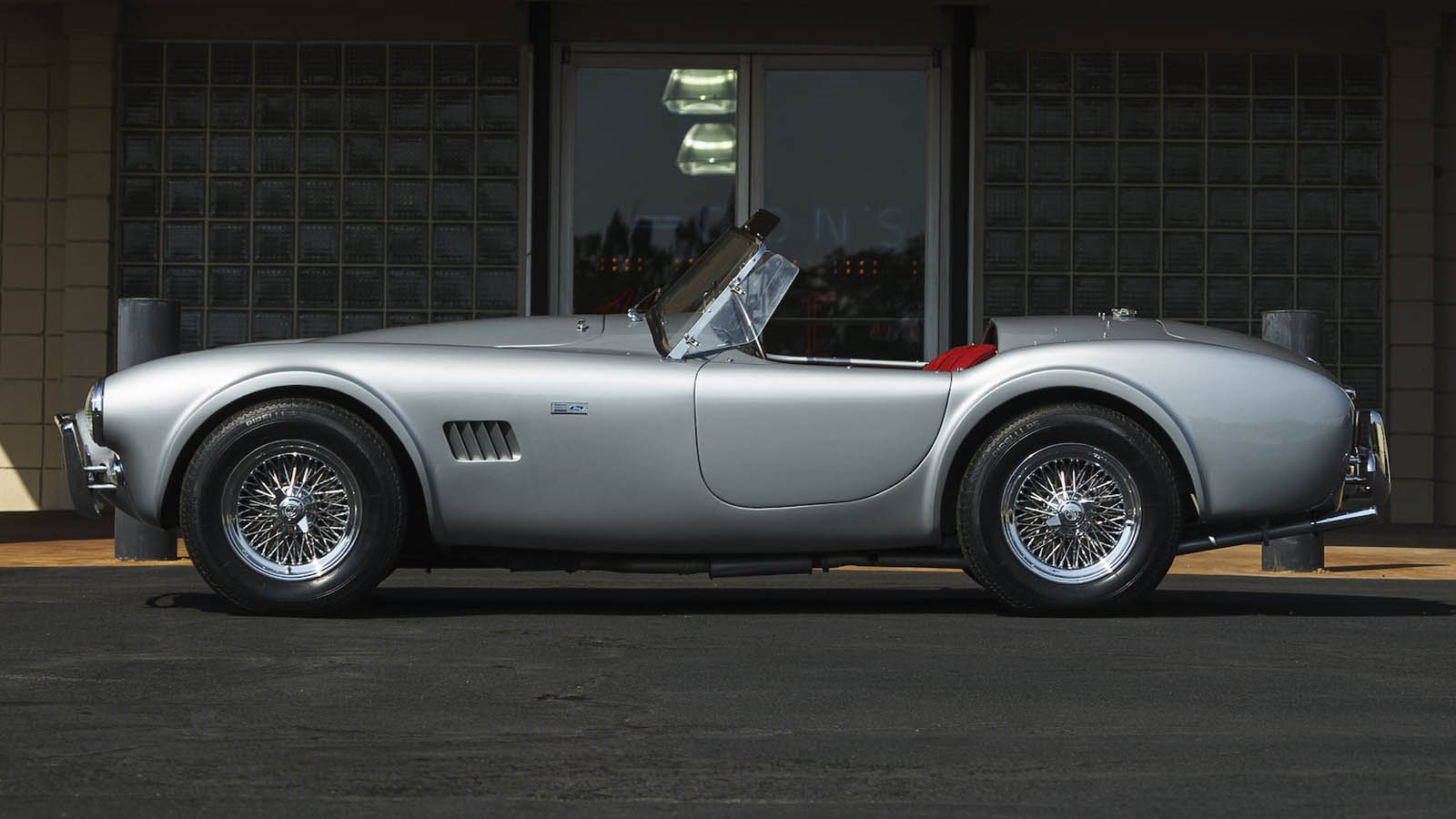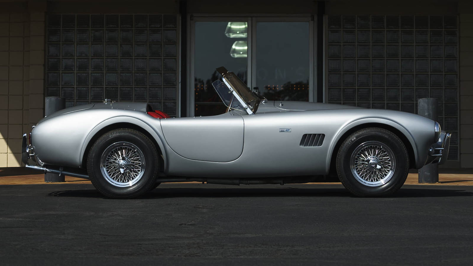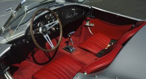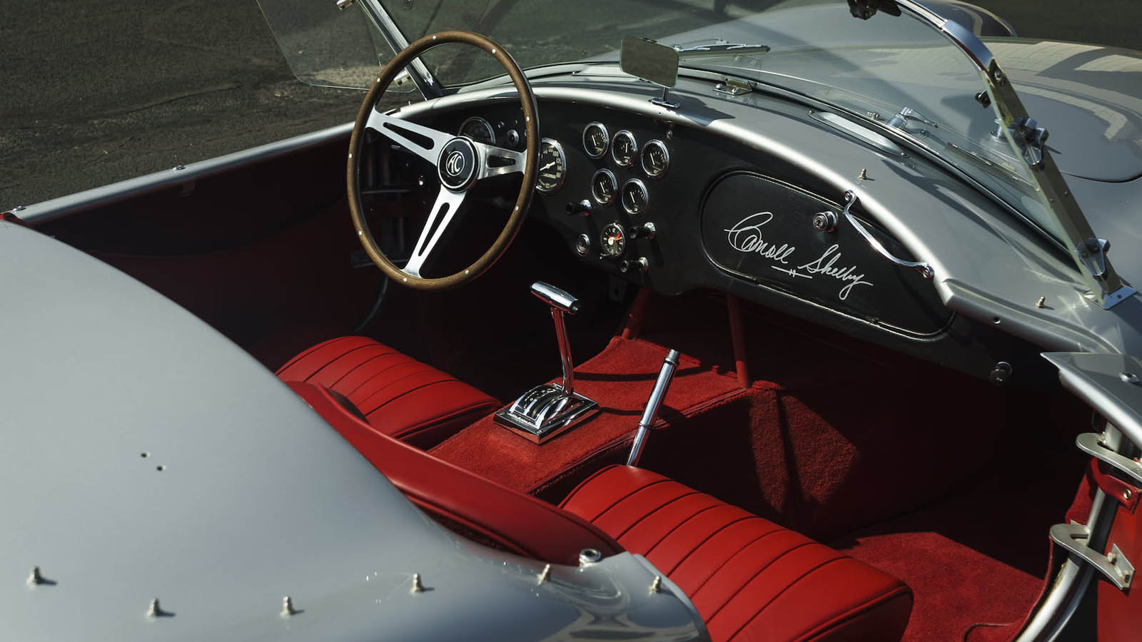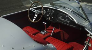 The car passed through the hands of a few different owners, painted black along the way, before being acquired by Jerry Heasley. The noted journalist and Cobra expert had it repainted to its original Mink Silver – which, to our eyes, goes rather well with the red leather interior.