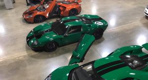 In August, a green Ford GT with black racing stripes was delivered alongside a ‘Beryllium Orange’ GT by Arkansas dealer Elite Autos LLC. That Orange GT actually sampled its color from the infamous Saleen S7. We’ve also seen Ford deliver a Riviera Blue GT from the Porsche palette and just a couple of days ago, another GT, this time painted Verde Mantis, a bright shade of green from Lamborghini.