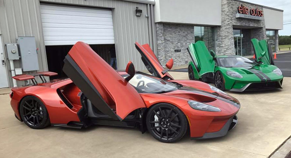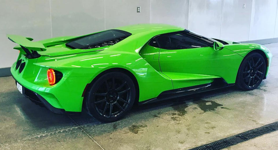In August, a green Ford GT with black racing stripes was delivered alongside a ‘Beryllium Orange’ GT by Arkansas dealer Elite Autos LLC. That Orange GT actually sampled its color from the infamous Saleen S7. We’ve also seen Ford deliver a Riviera Blue GT from the Porsche palette and just a couple of days ago, another GT, this time painted Verde Mantis, a bright shade of green from Lamborghini.
