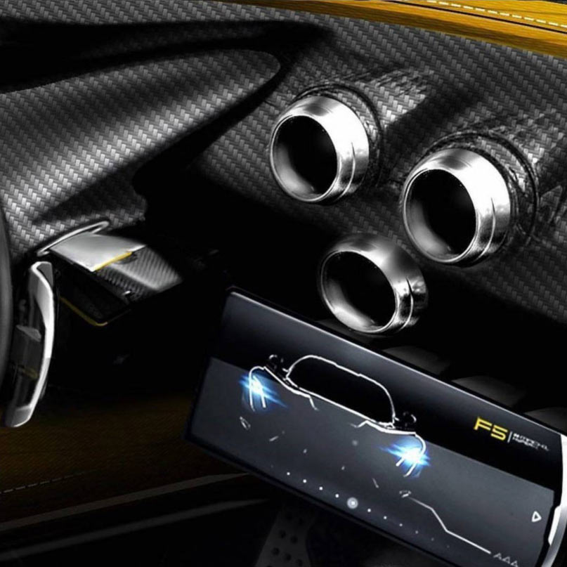 The most eye-catching feature is the three circular air vents which have been arranged in a similar triangular shape to the trio of tailpipes. Additionally, the teaser reveals a slim, horizontal touchscreen in place of analog switches, buttons, and dials. Part of the steering column and paddle shifters are also visible.