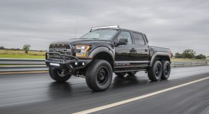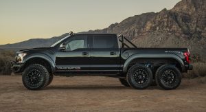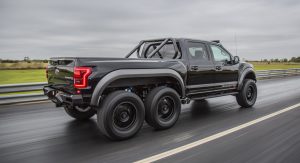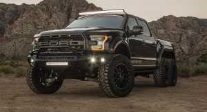 So what does paying the hefty sum bring you? Well, a base 2018 Ford F-150 Raptor crew-cab, which will then be turned into a six-wheeled machine, benefiting from the 6×6 locking rear axles, upgraded suspension, 20-inch wheels wrapped in Toyo off-road tires, special front and rear bumpers, roll bar, and LED lights.