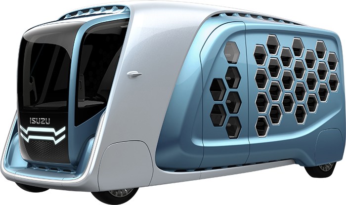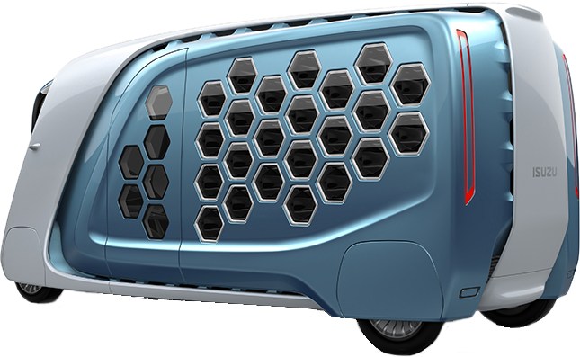 The honeycomb pattern isn’t simply a design exercise as each window is actually its own storage compartment. Isuzu says this provides a “good compromise between strength and space needed for storage.”