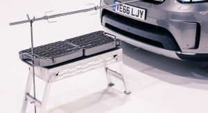 Starting up front, the Land Rover badge on the grille can be turned to the side to reveal a hidden power take off unit. It can be used to power a pasta maker and a rotisserie for a grille.