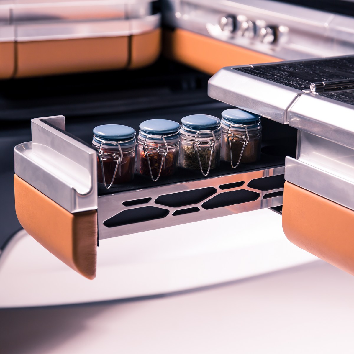 The unique features continue in the cabin as there’s a toaster in the center console and a jam storage unit behind the climate controls. If that wasn’t insane enough, the Discovery has also been equipped with an herb garden, a spice rack, and a slide-out kitchen complete with a gas burner, sink, dining table, and 40-inch TV.