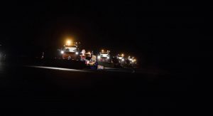 The operator drives (or rides in) the designated lead tractor, and operates the others remotely as drones – controlling the steering, throttle, brakes, transmission, differentials, peripherals, and auxiliary functions, right down to the ignition and parking brake… all remotely.