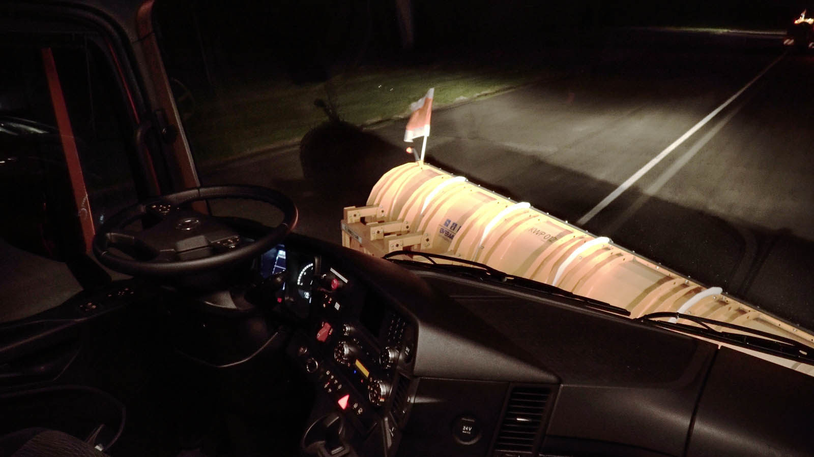 Each tractor is pulling a giant snow plow/blower with a 26-foot-wide blade on a powered semitrailer (with its own six-cylinder engine) in a rig measuring over 75 feet long and weighing 25 metric tons.