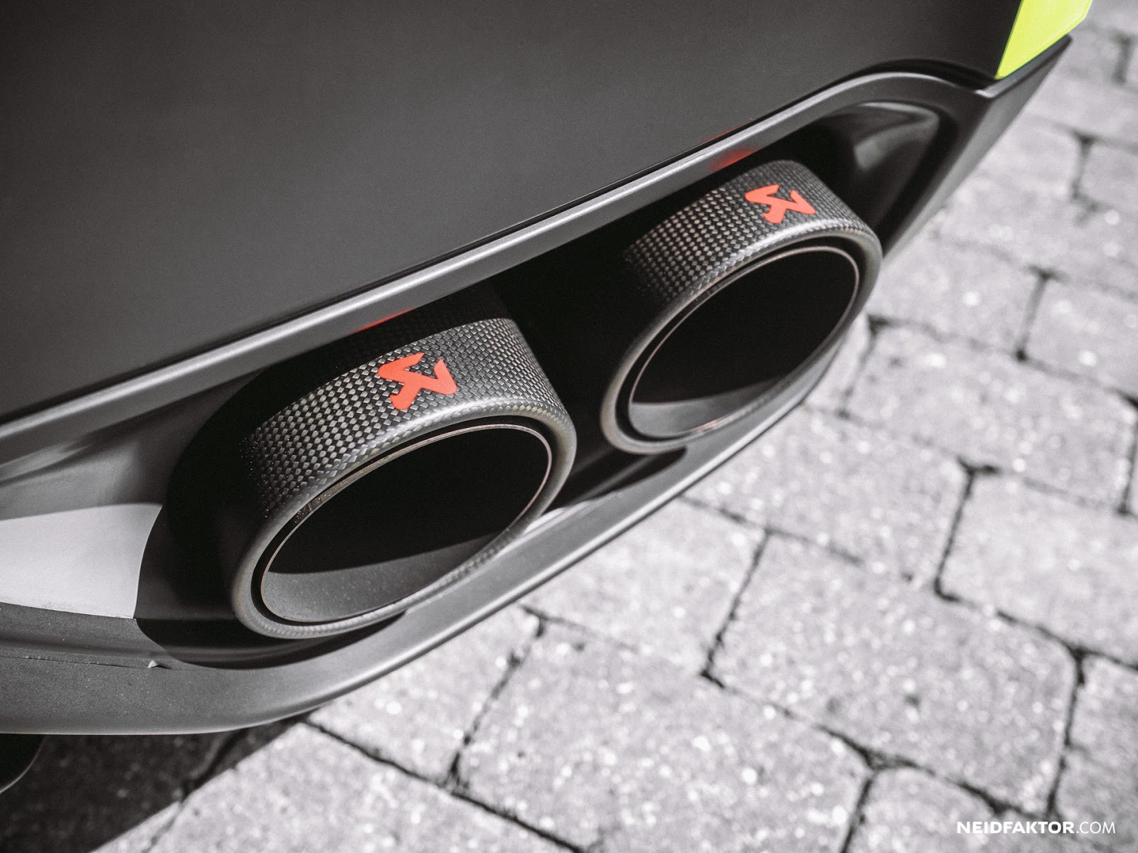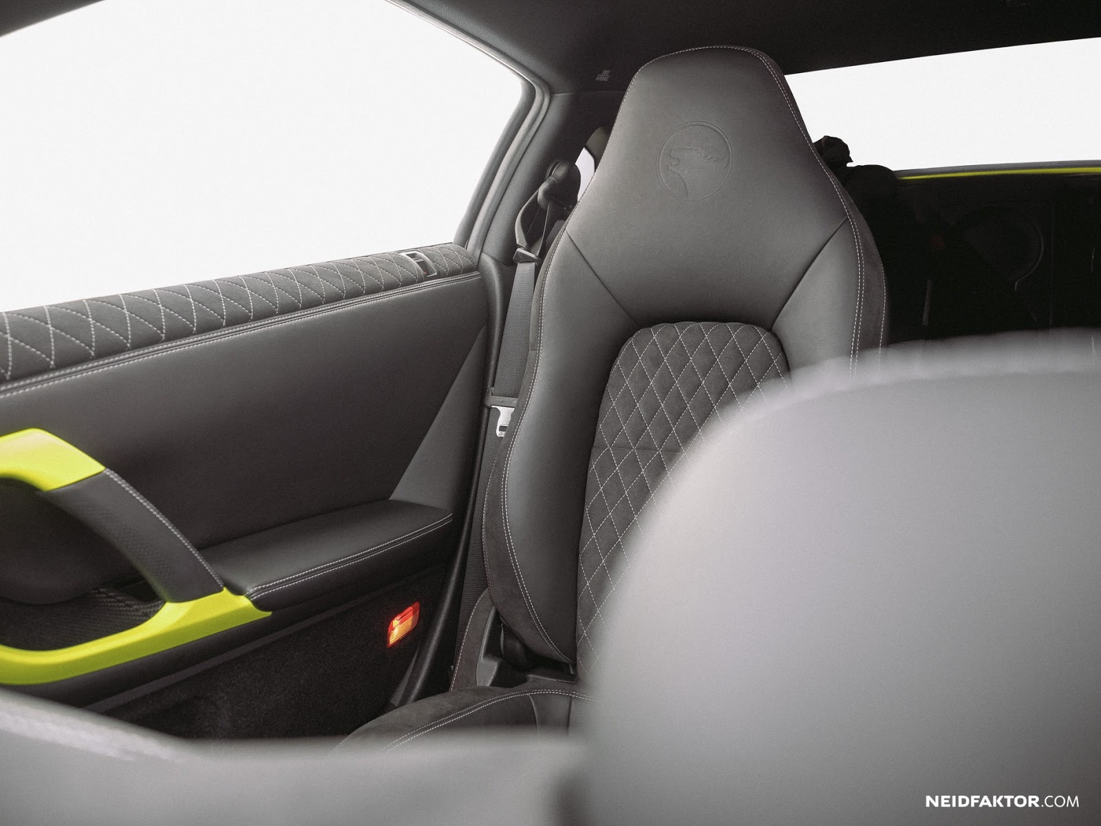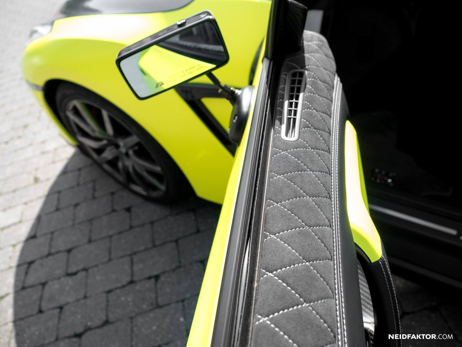 Fittingly, a healthy dose of matte carbon fiber accents can be found throughout, including on the A-pillars, dashboard, center console and doors. To match the vehicle’s fluro yellow wrap, Neidfaktor also added color-matching grab handles.