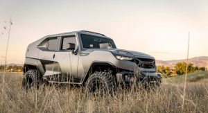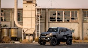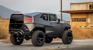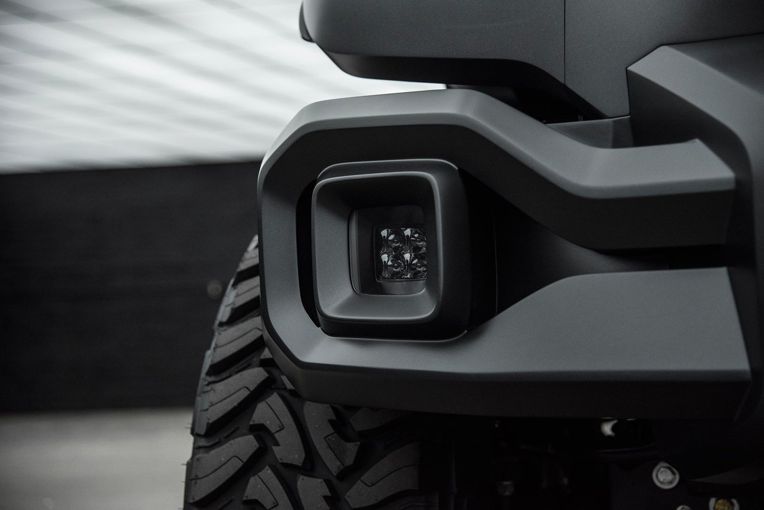 Described as “an extreme utility vehicle built for any off-road and on-road challenge”, it has a hairy-chested exterior design, featuring lots of angular lines, small, military-like windows, auxiliary lights, and chunky tires for better traction.