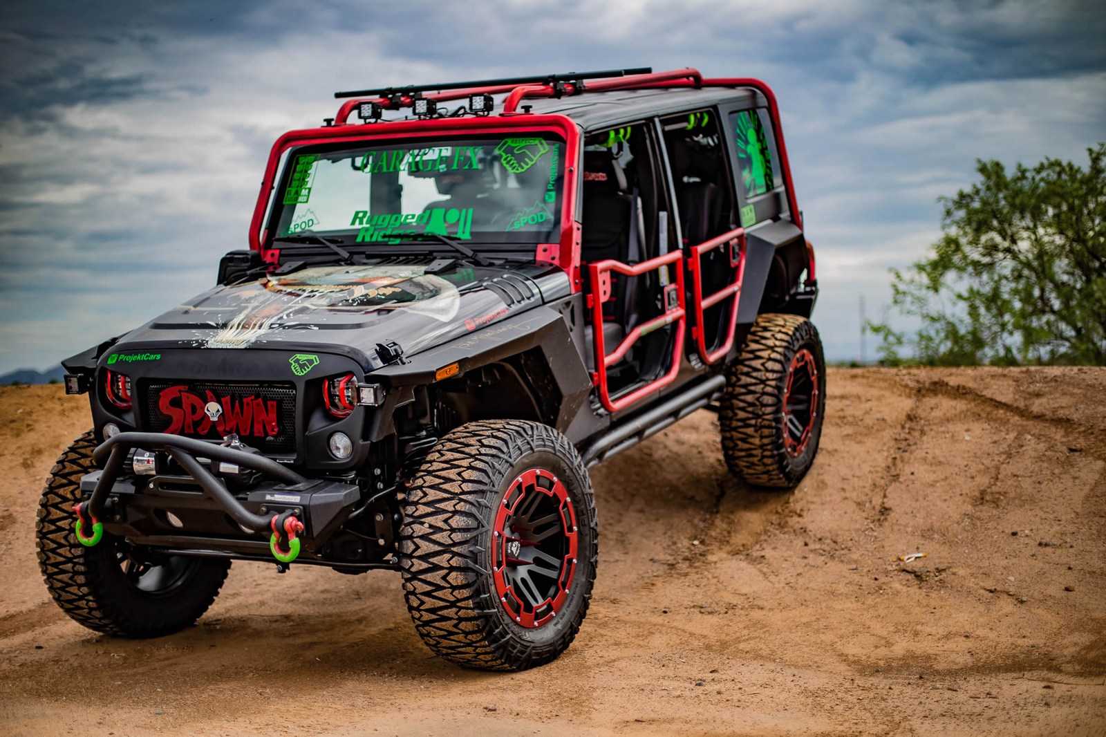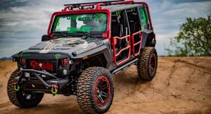 The second vehicle is based on the Jeep Wrangler Unlimited and has custom fender flares, rugged bumpers, and a unique grille. We can also see rocker guards, a ventilated hood, and beadlock wheels with massive off-road tires. Other notable features include tubular doors, auxiliary LED lights, and a winch.