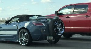 First, the spare wheel attached to the rear end. Where do we even begin with that? It might look good on a Wrangler, but on a two-door sporty convertible? Let’s just say utility vehicles and sports car don’t usually mix, so let us know how you feel about that.