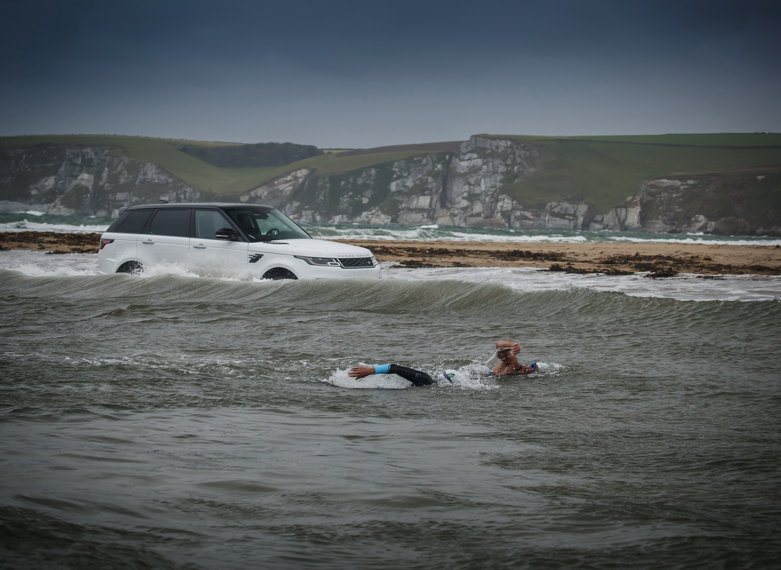For this challenge, the automaker wanted the SUV to arrive at Burgh Island, from Bantham Beach, in South Devon, UK, before former open-water swimming world champion Kerri-anne Payne, and athlete adventurer Ross Edgley.