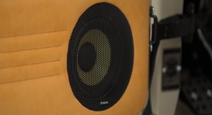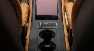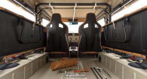The cabin is adorned with an exposed metal dashboard, custom leather, Recaro Sportster CS bucket seats up front, jump seats in the back, a custom sound system with iPod dock, canvas roof and windows, and gunmetal control surfaces to match the exterior trim.