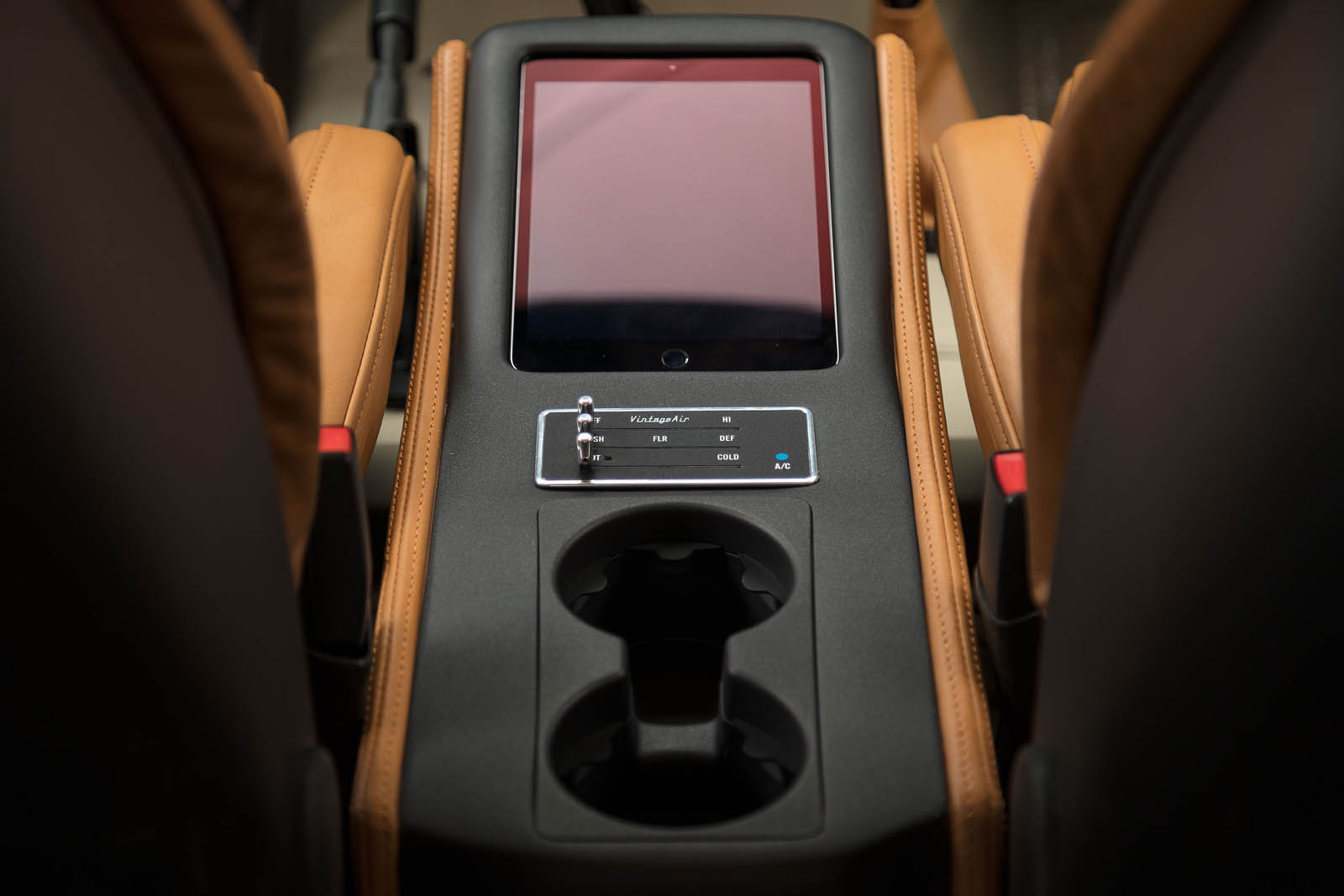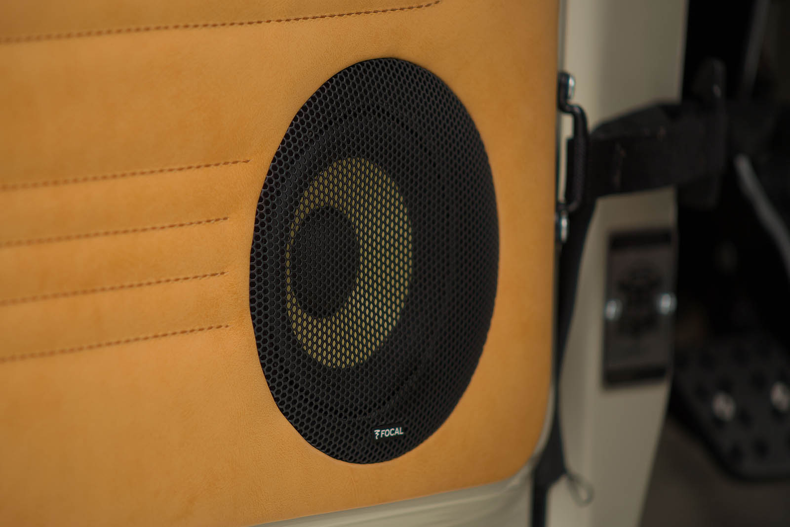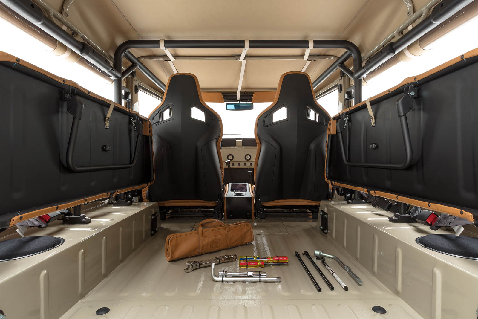 The cabin is adorned with an exposed metal dashboard, custom leather, Recaro Sportster CS bucket seats up front, jump seats in the back, a custom sound system with iPod dock, canvas roof and windows, and gunmetal control surfaces to match the exterior trim.
