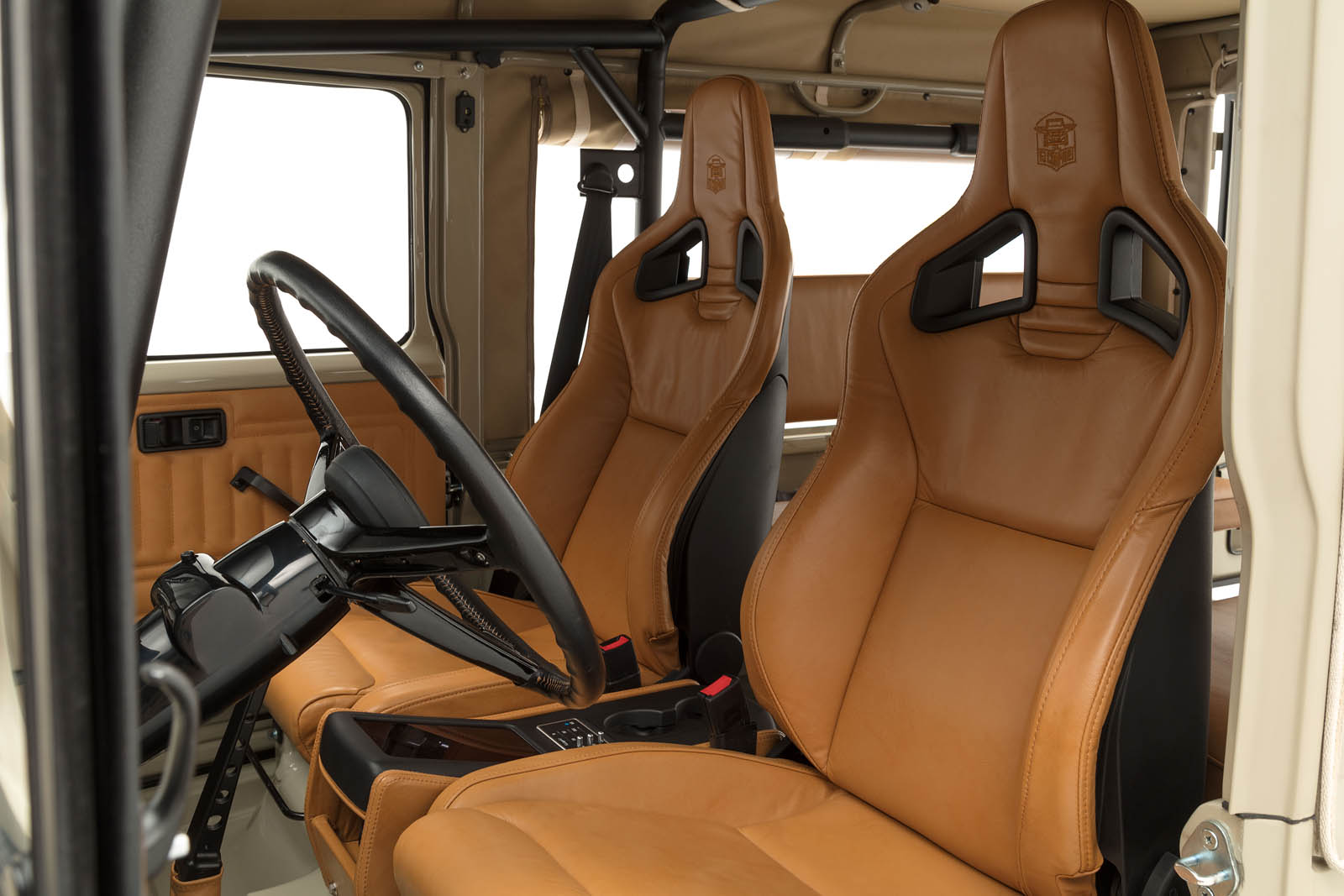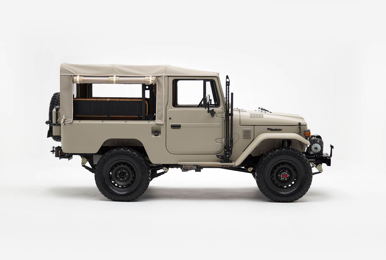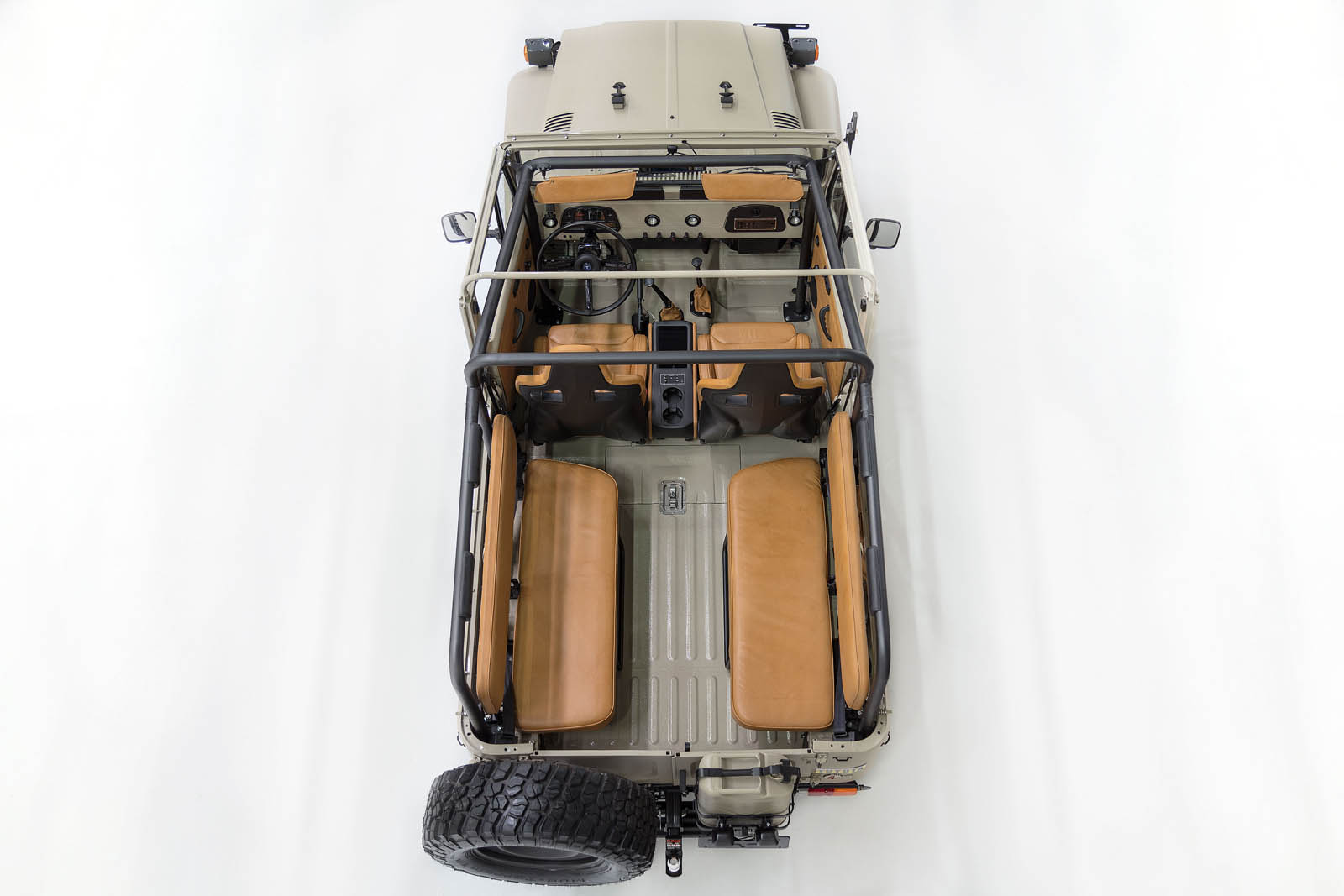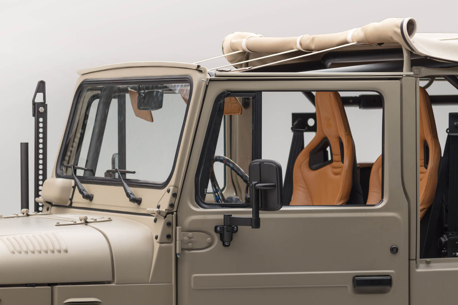 This FJ43 Signature is painted in matte Dune Beige, with custom-crafted fuel cap and larger side mirrors, CNC-machined from aluminum and painted gunmetal gray.