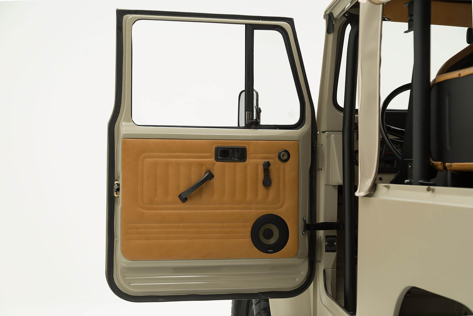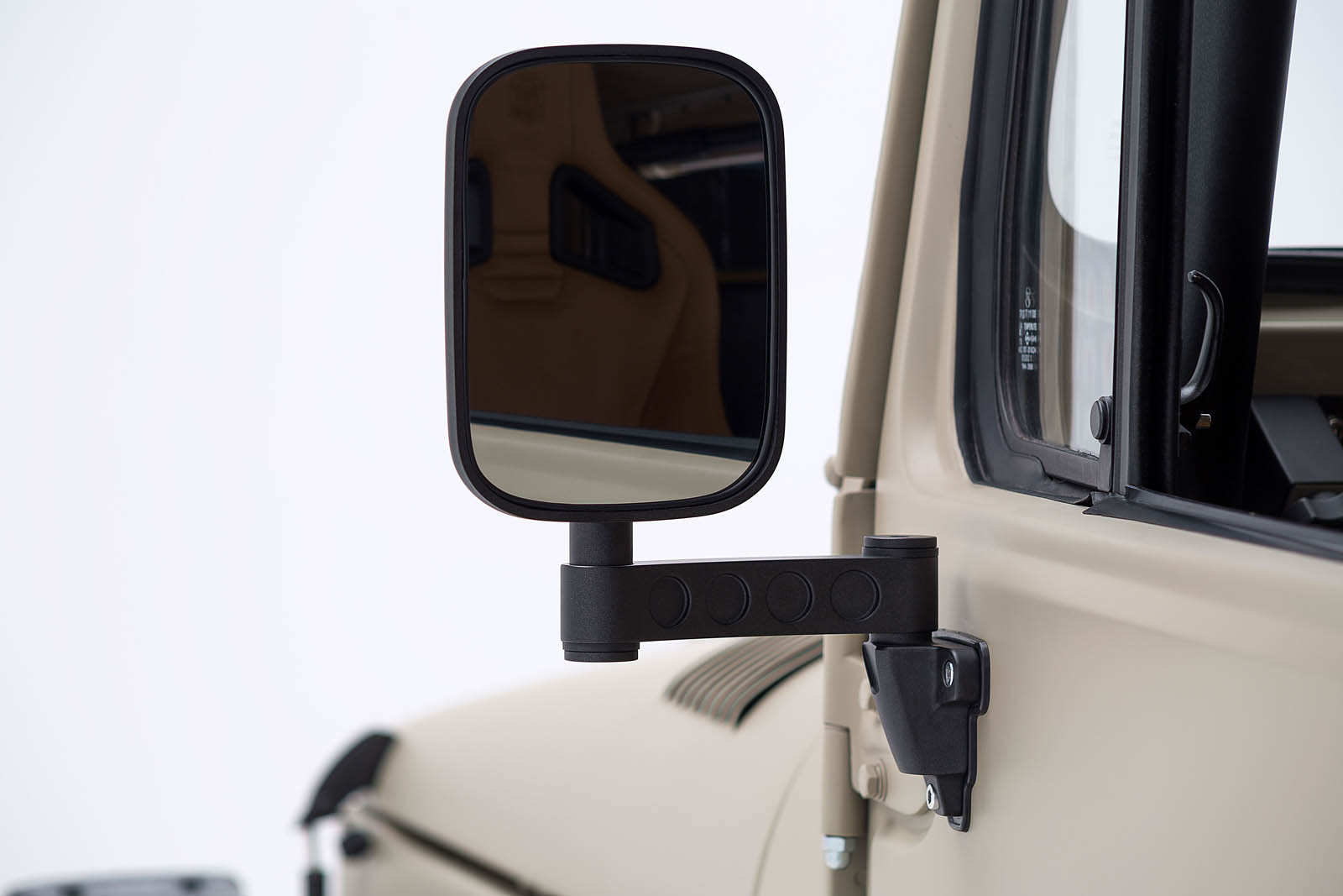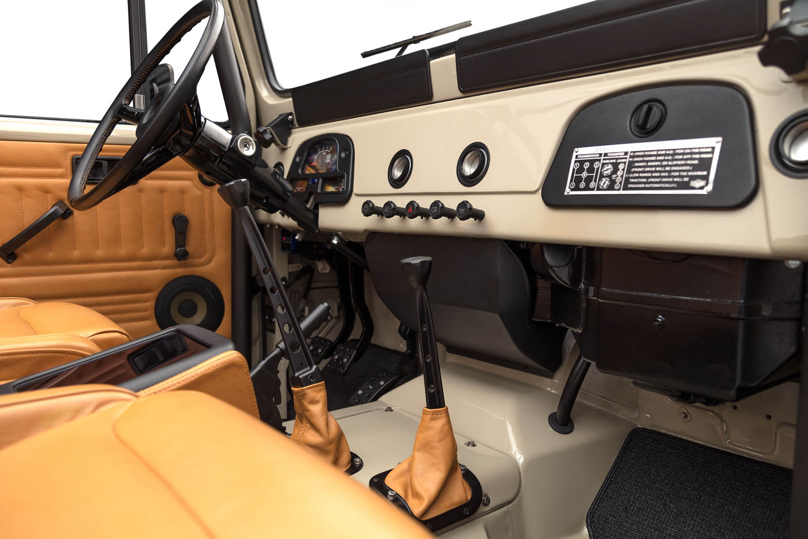 This FJ43 Signature is painted in matte Dune Beige, with custom-crafted fuel cap and larger side mirrors, CNC-machined from aluminum and painted gunmetal gray.