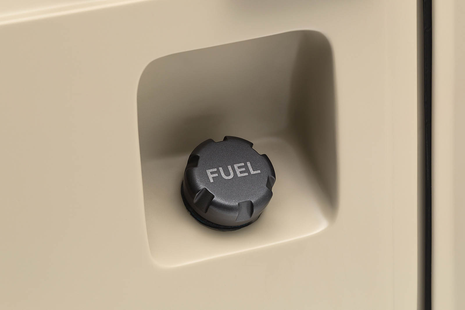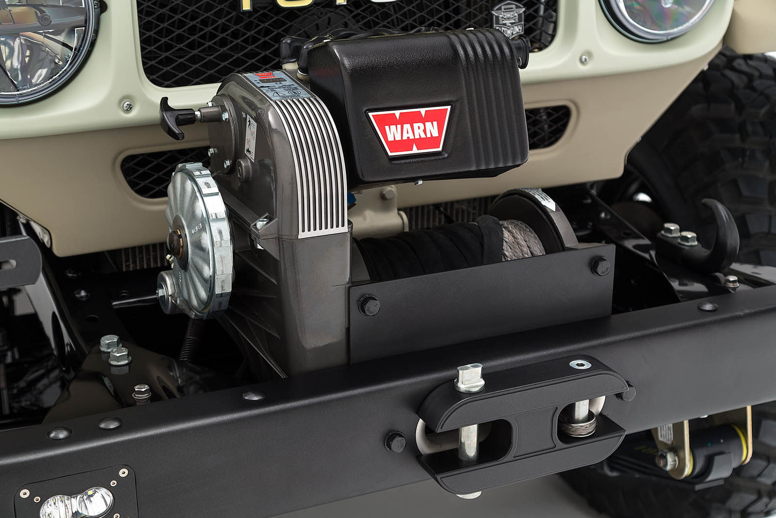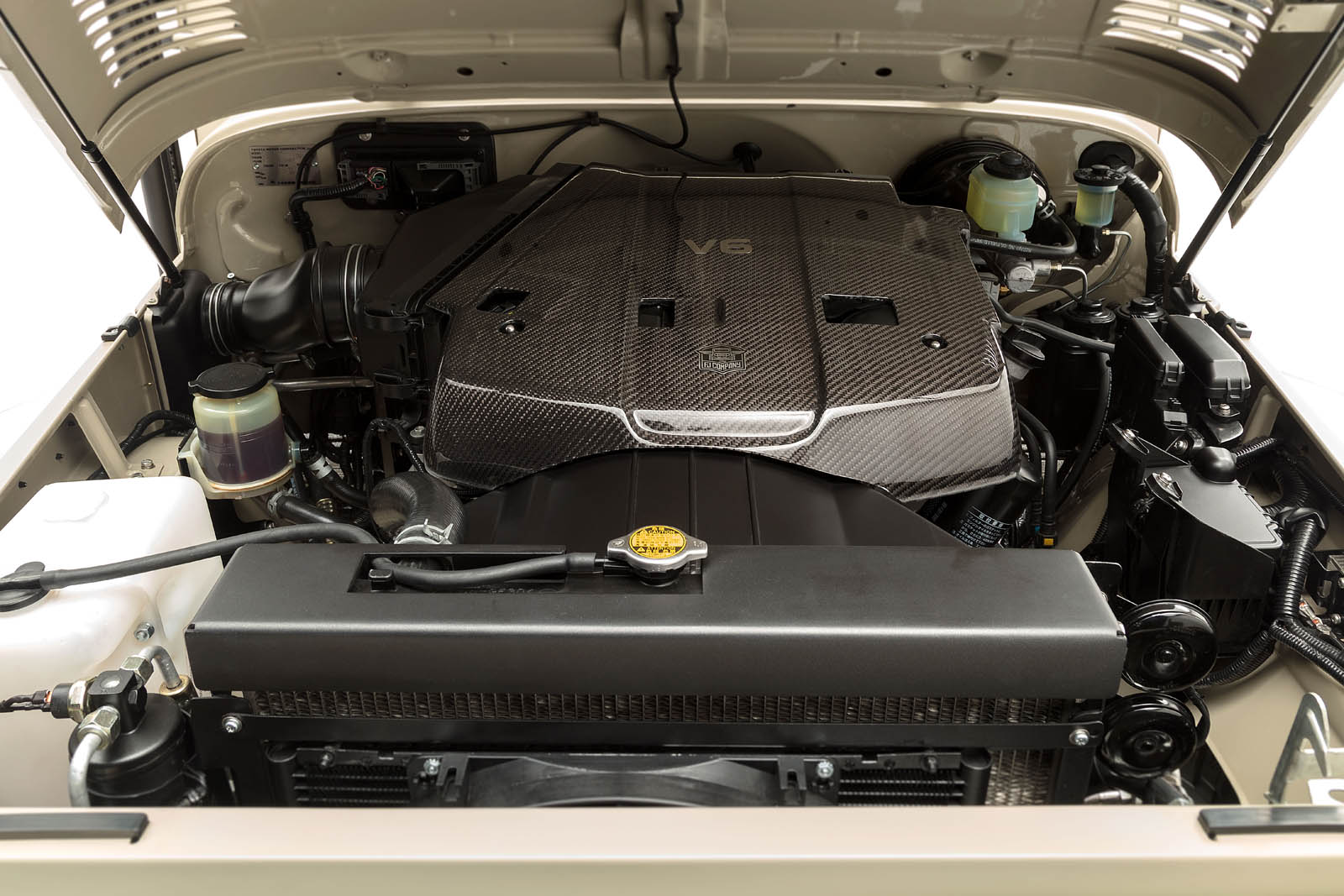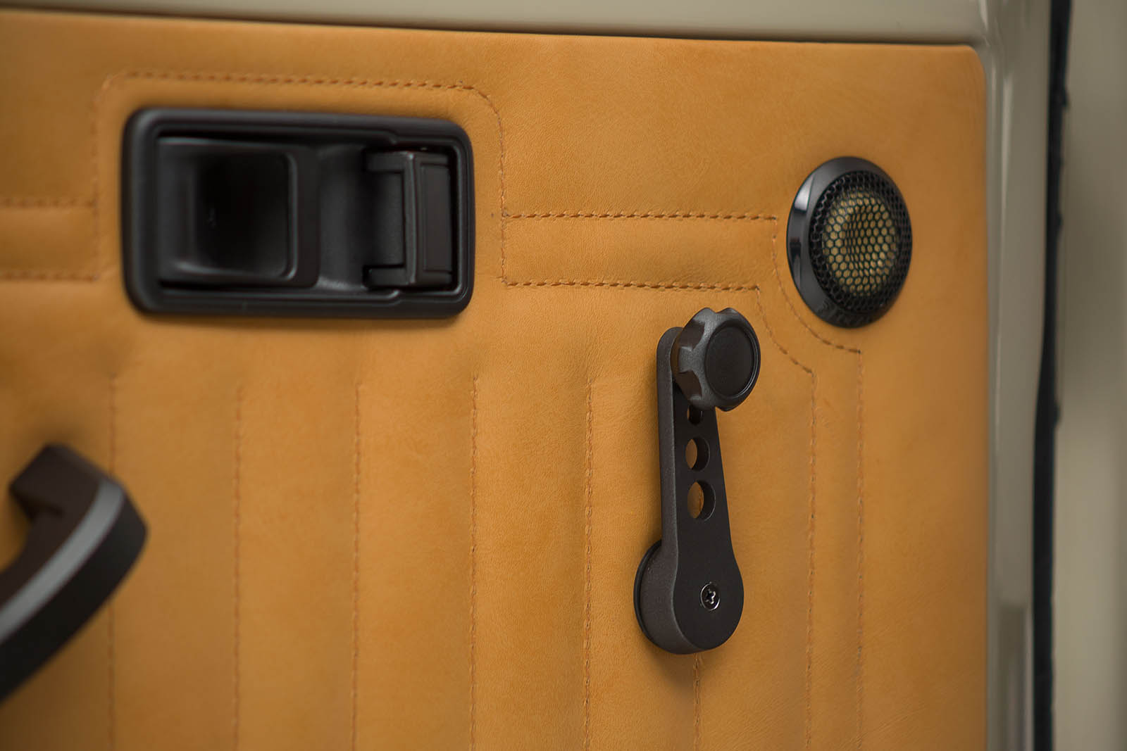 This FJ43 Signature is painted in matte Dune Beige, with custom-crafted fuel cap and larger side mirrors, CNC-machined from aluminum and painted gunmetal gray.